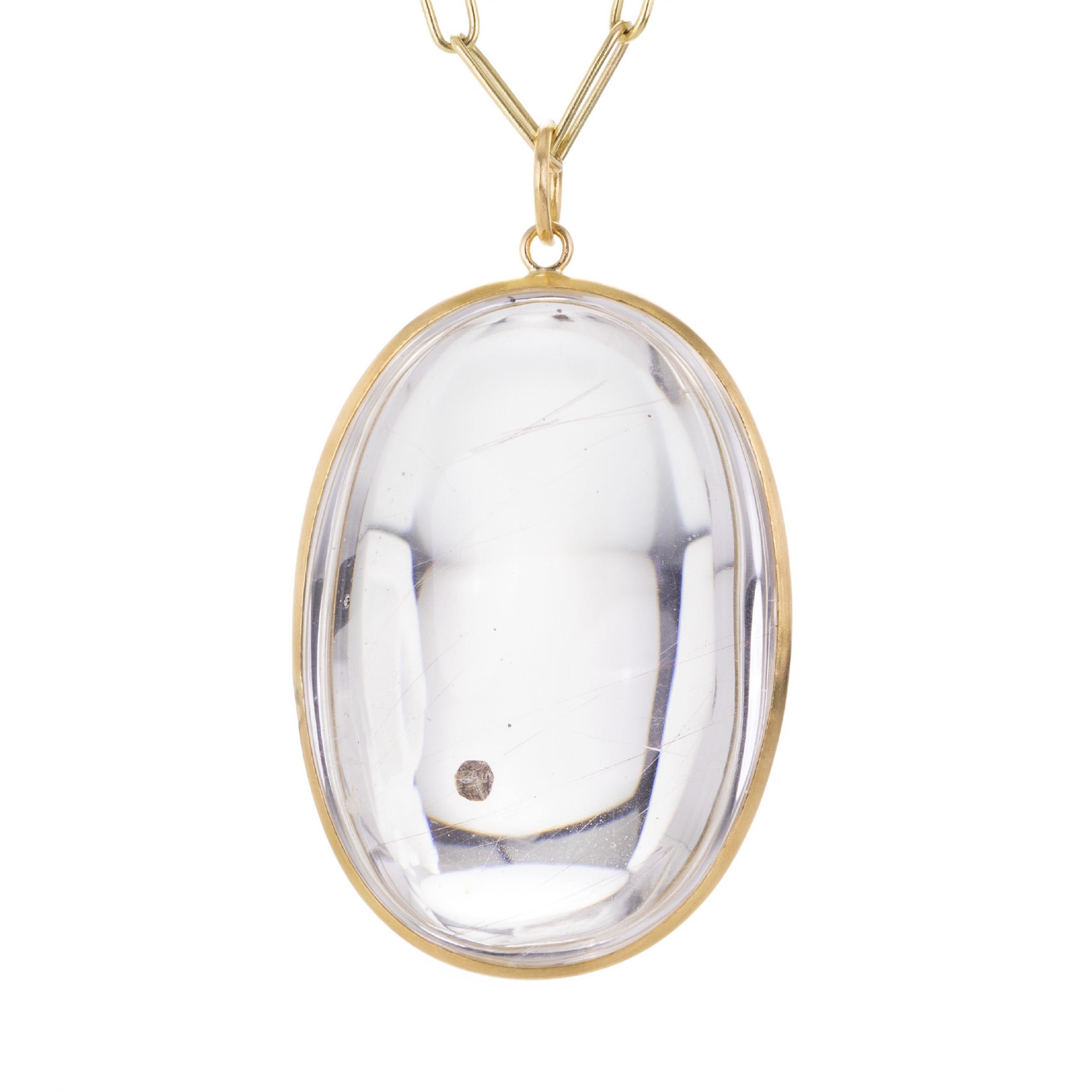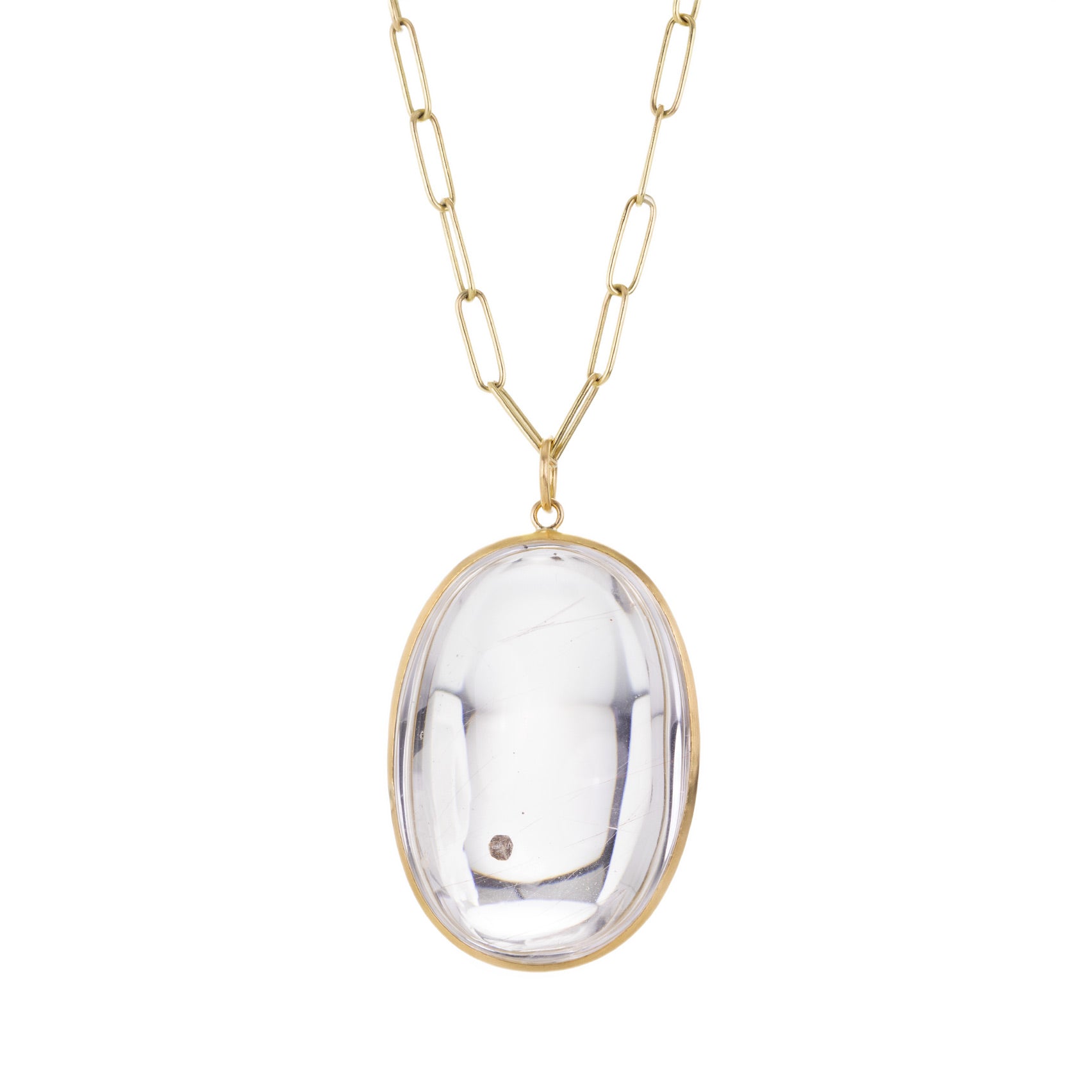 This 18k yellow gold rutilated quartz pendant from Maria Beaulieu is complete with a fascinating pyrite cube inclusion that commands a closer look! The large oval stone is ready to go with anything and everything you own. Pair it with one of the artist’s coveted handmade chains to complete the designer look. Quartz measures 32mm x 45mm. Total length measures 2" including bail. Pendant only, chain is sold separately. Handcrafted in Brooklyn, NY, U.S.