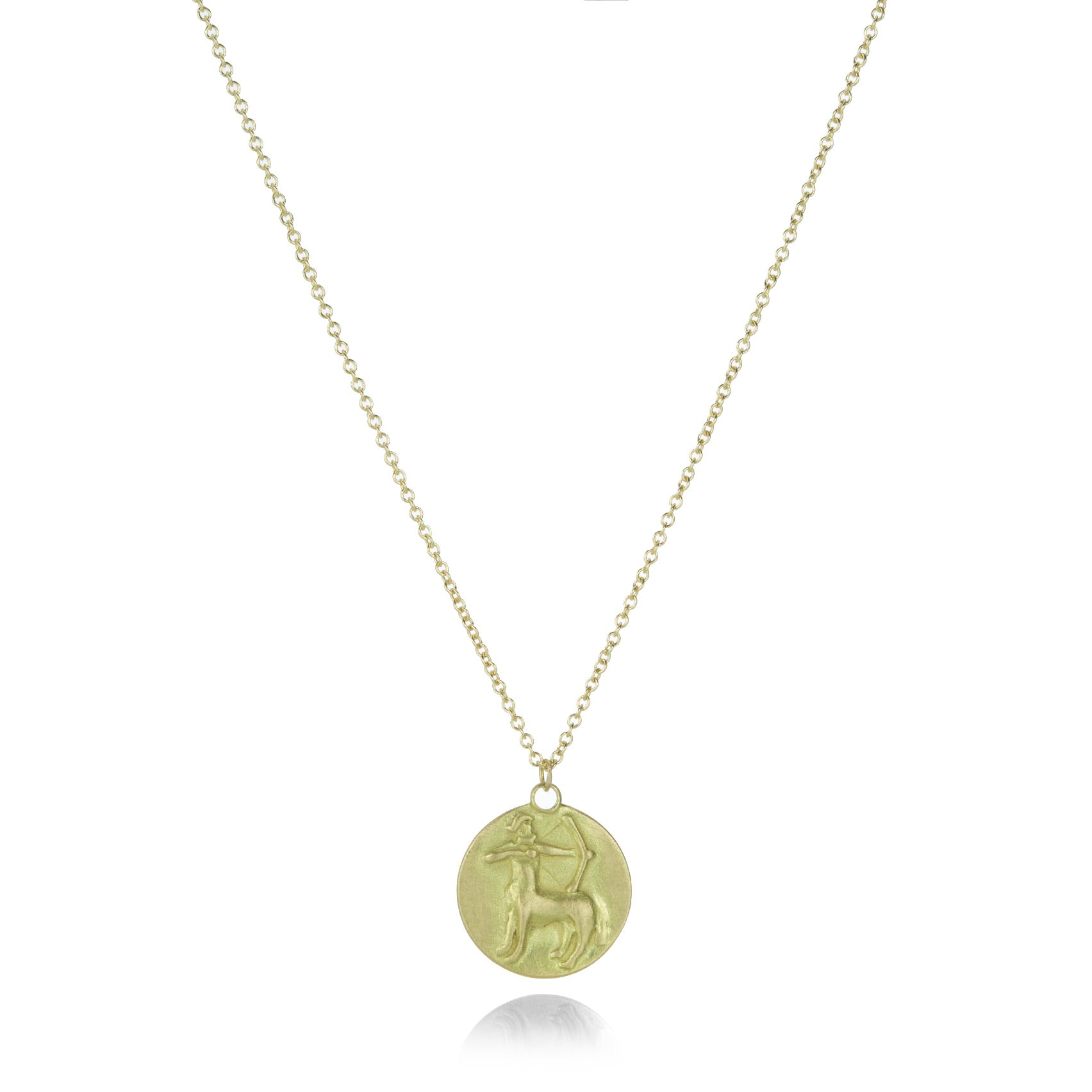 Calling all Sagittarians! This 18k yellow gold necklace from Marian Maurer celebrates you with a round, brushed, hand carved Sagittarius pendant. Ruled by Jupiter and the element of fire, those born under this sign are adventurous, optimistic, creative and generous. Pendant measures approximately 1/2" in diameter on a 16" chain. Handcrafted in Brooklyn, NY, U.S.