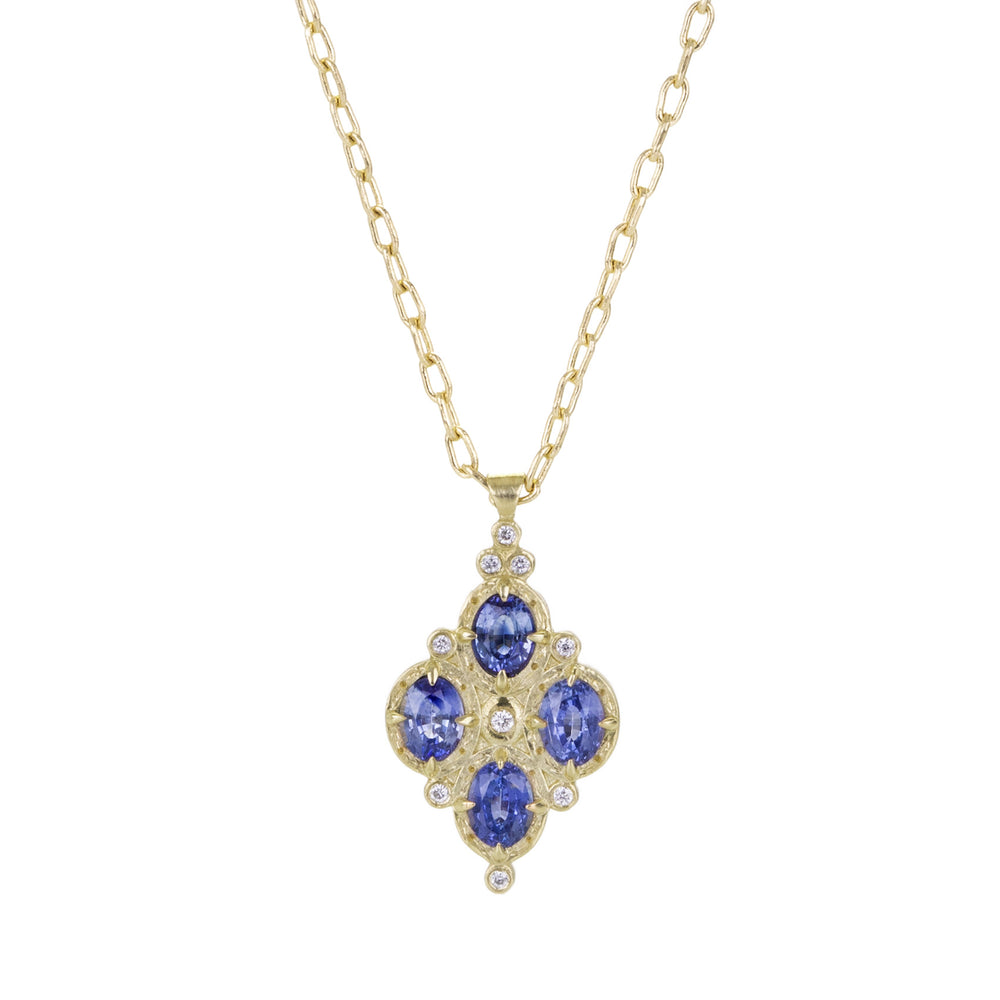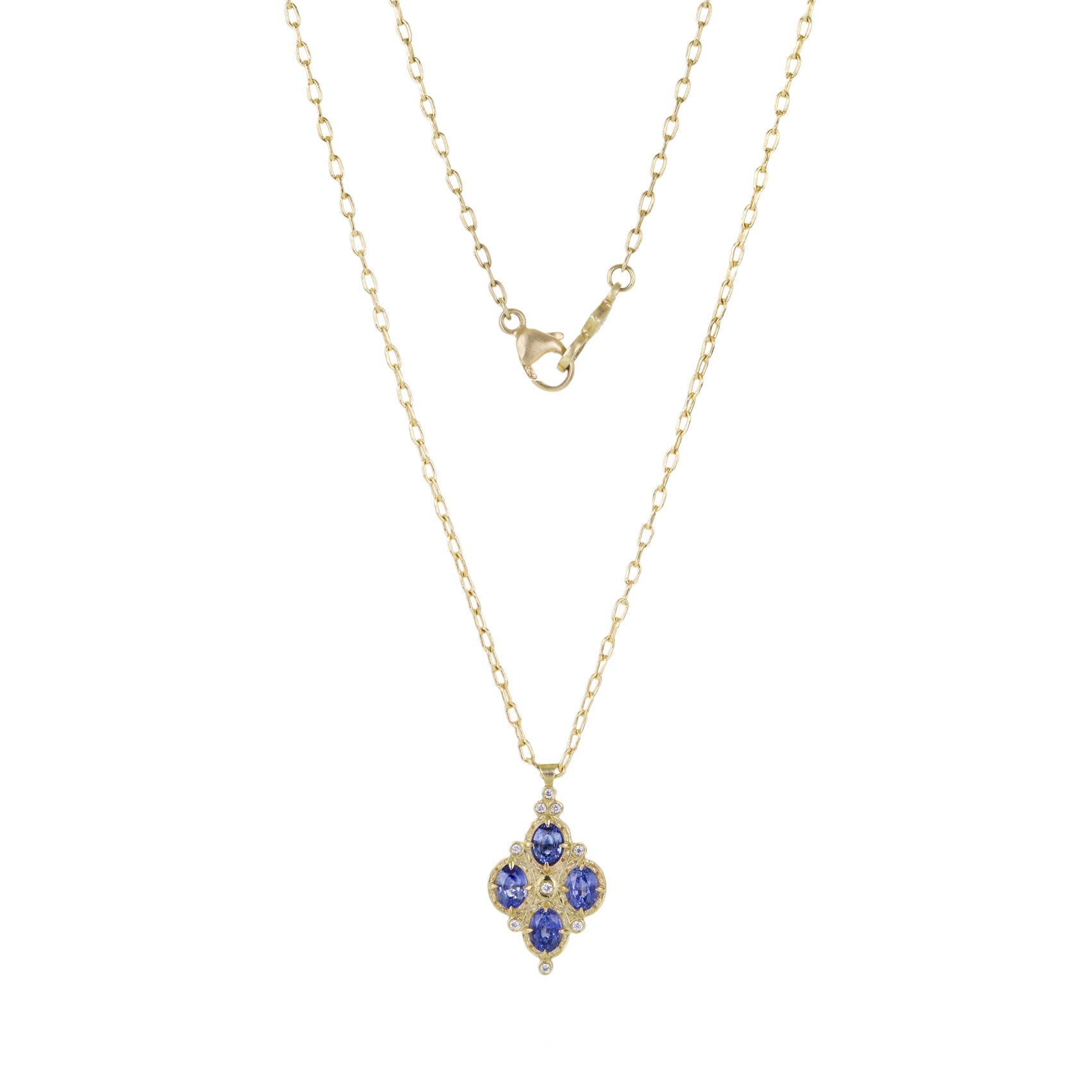 An 18k yellow gold Cardinal pendant necklace with blue sapphires and white diamonds. Pendant measures 3/4" on a chain that can be worn at 16" or 18". Handcrafted in Rhinebeck, NY, U.S.
