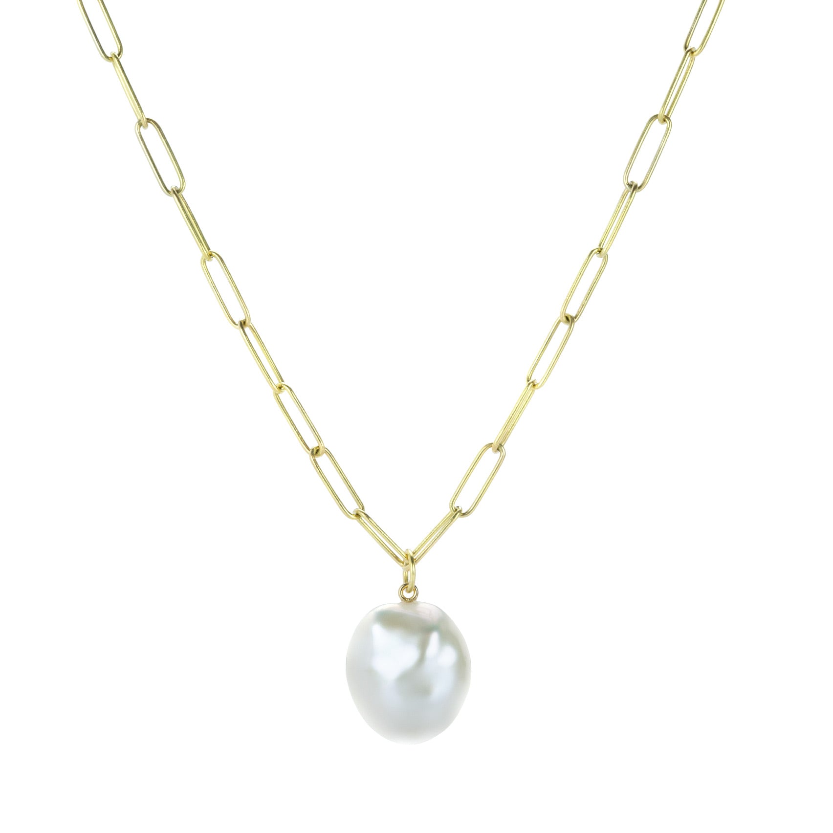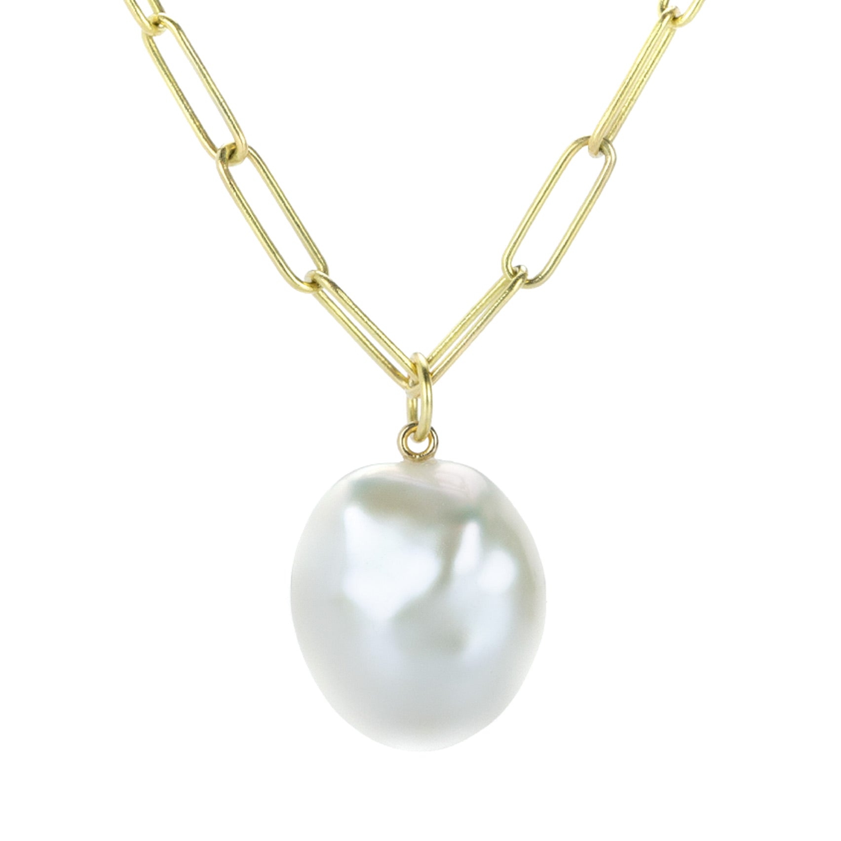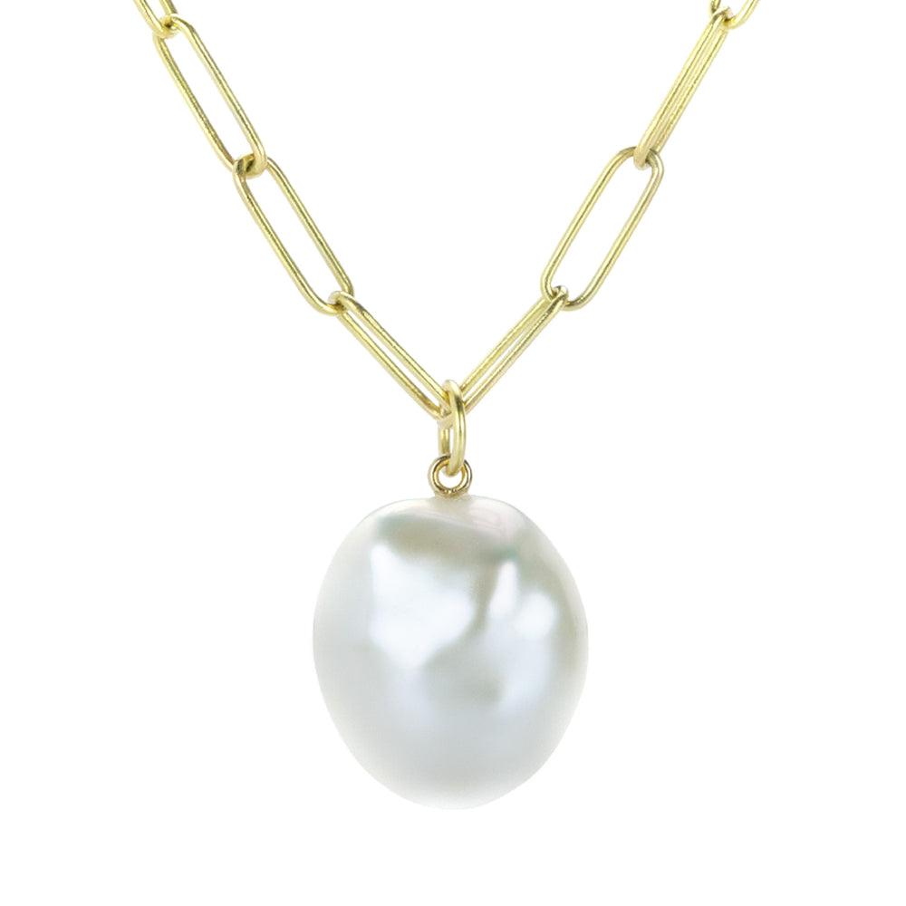 This exquisite 18k yellow gold pendant from Maria Beaulieu features a beautiful satin-white, baroque freshwater pearl. The lustrous, irregularly shaped pearl exudes organic elegance, while the gold setting provides a classic, timeless look. Pair it with one of the artist’s coveted handmade gold chains to complete the look! Pearl measures 16mm x 19mm. Total pendant length measures 1” x 5/8” including bail. Chain is sold separately. Handcrafted in Brooklyn, NY, U.S.