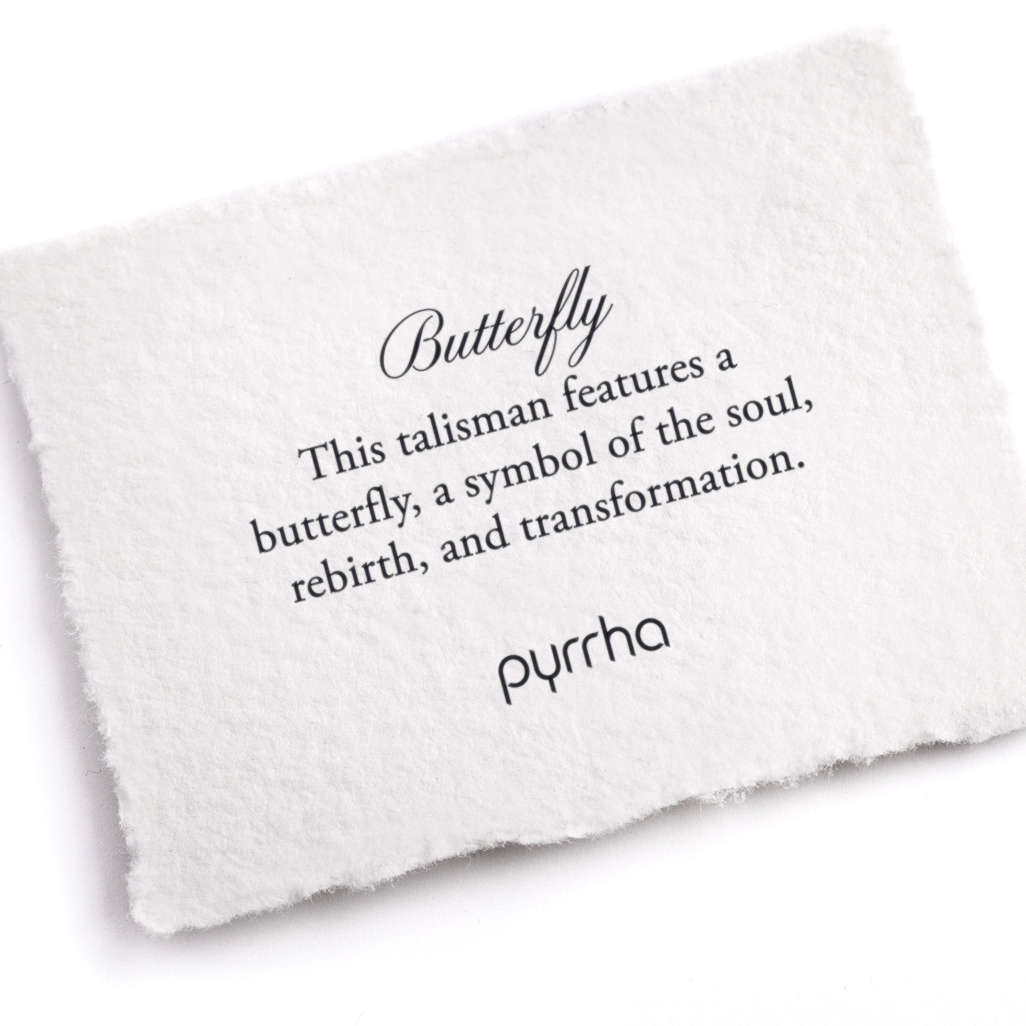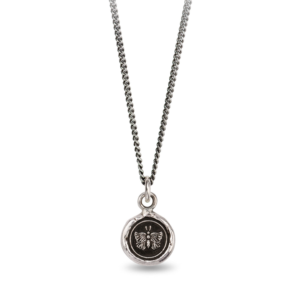 A symbol of the soul, the butterfly on this Pyrrha pendant also represents birth and transformation. Lovingly and sustainably cast in recycled sterling silver with black contrast, this potent talisman hangs on an 18" oxidized sterling silver 1.5mm curb chain with lobster clasp. Pendant measures 3/4" in length, including bail. This piece makes a perfect gift of encouragement for yourself or a loved one! Handcrafted in Vancouver, Canada.