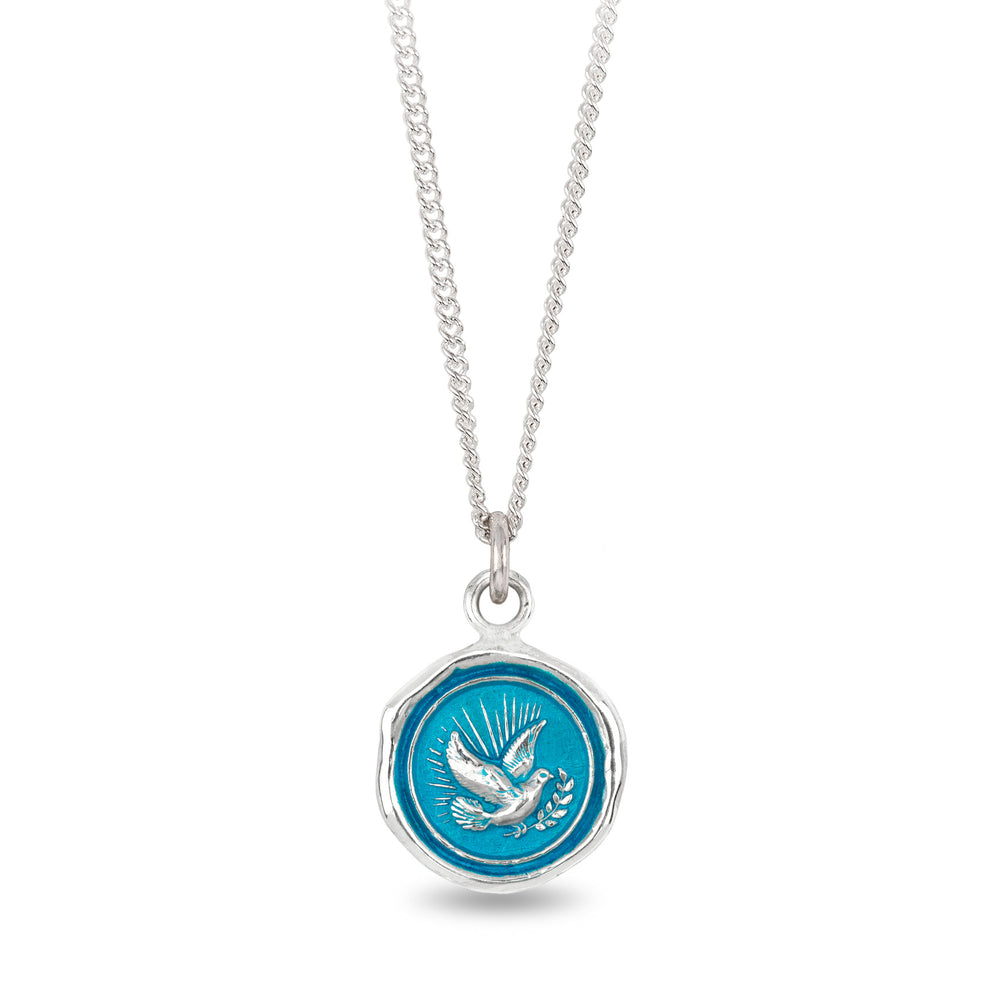 The dove on this Pyrrha pendant symbolizes peace and love, embodying a spirit of understanding and compassion. It inspires forgiveness and encourages you to seek resolutions in times of conflict. Lovingly and sustainably cast in sterling silver, this potent talisman is enhanced with a gem-like translucent blue ceramic layer and hangs on a 22" fine curb chain with lobster clasp. Pendant measures 7/8" in total length, including bail. Handcrafted in Vancouver, Canada.