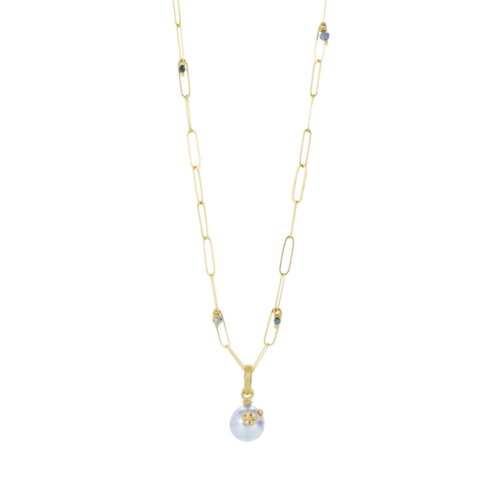 Inspired by the wondrous flora that surrounds us, this 18k yellow gold pendant from Lene Vibe features a small gray akoya pearl with a beautiful carved flower and a bezel set, 0.01ct brilliant diamond.. Total length measures 7/8" including bail. Pendant only, chain is sold separately. Handcrafted in Denmark.