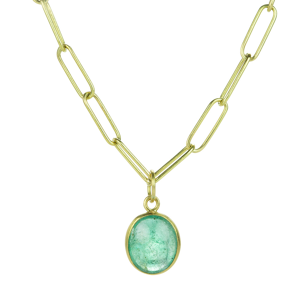 This brilliant emerald pendant from Maria Beaulieu will refresh your style and senses. Set simply in an 18k yellow gold bezel to let the stone do the talking, this pop of color is sure to infuse a rush of energy. Pair it with one of the artist’s coveted handmade chains to complete the designer look. Emerald measures 10mm x 11mm. Pendant length measures 3/4”. Chain sold separately. Handcrafted in Brooklyn, NY, U.S.