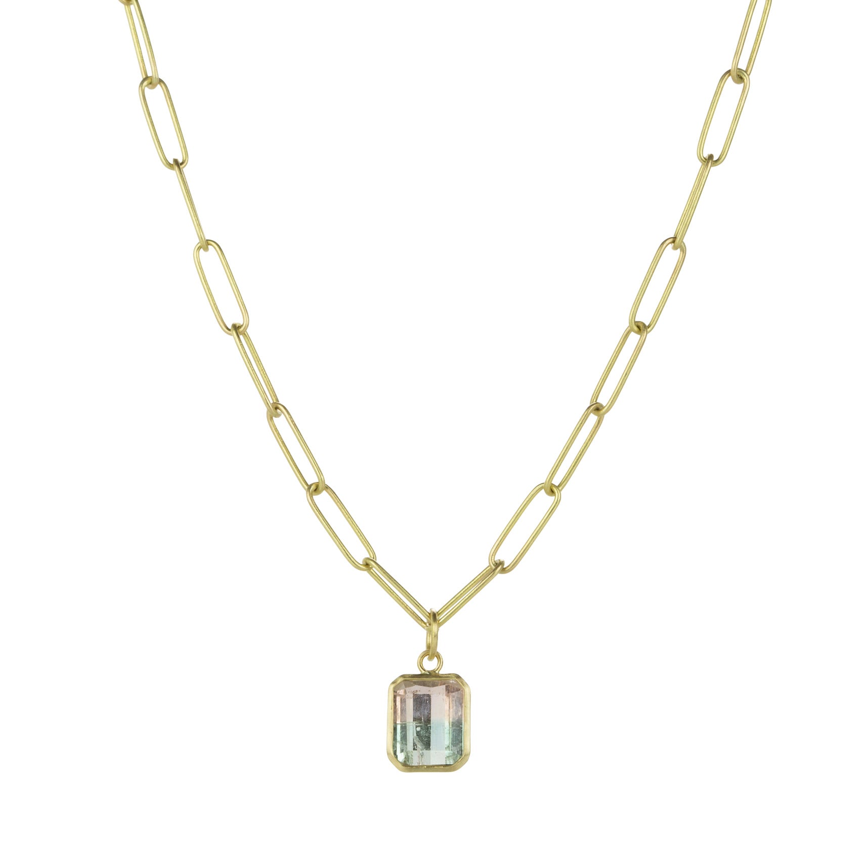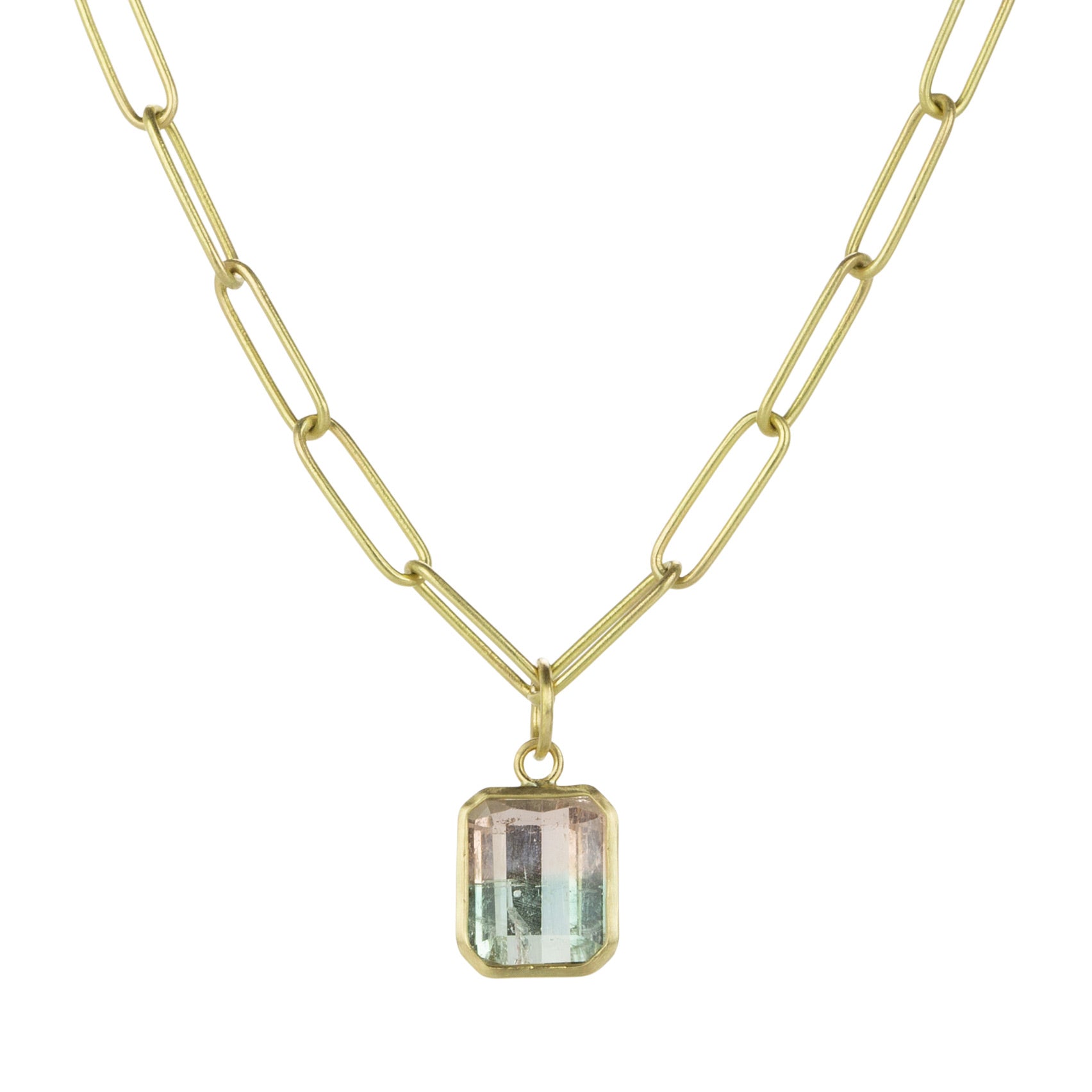 This 18k yellow gold pendant from Maria Beaulieu features a small emerald cut pale pink and green tourmaline in the gentlest of hues. Add some sparkle with just a hint of juicy color! Pair it with one of the artist’s coveted handmade chains to complete the designer look. Pendant measures 11/16" in total length, including bail. Pendant only, chain is sold separately. Handcrafted in Brooklyn, NY, U.S.