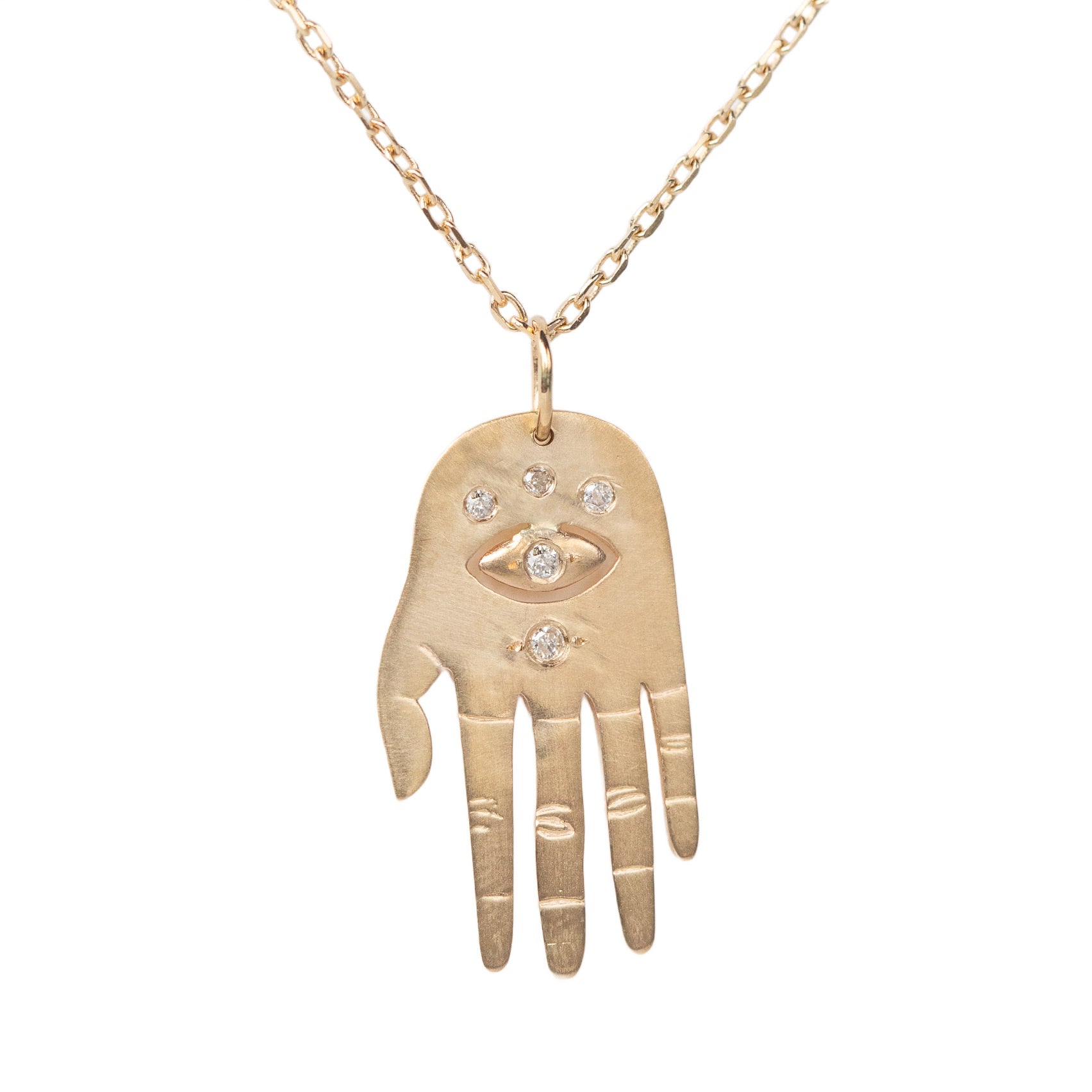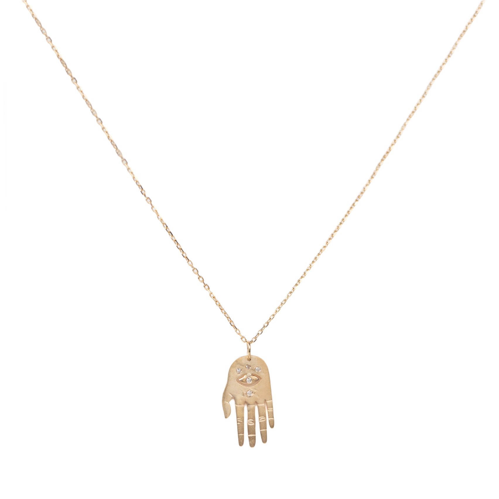 A 14k yellow gold chain with a small protection hand pendant with a carved eye and white diamond accents totaling 0.02ct. Pendant measures 7/8" on a 20" chain. Handcrafted in Belgium.