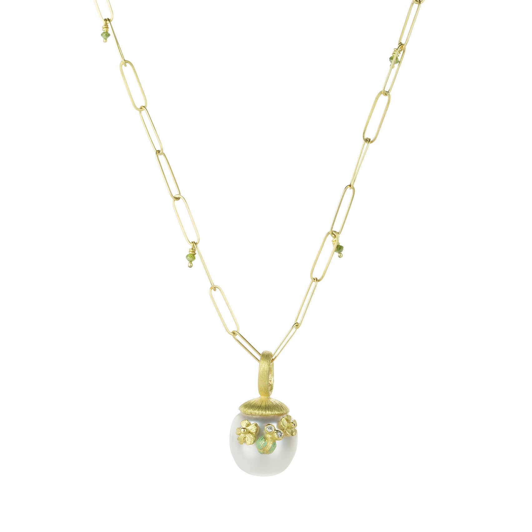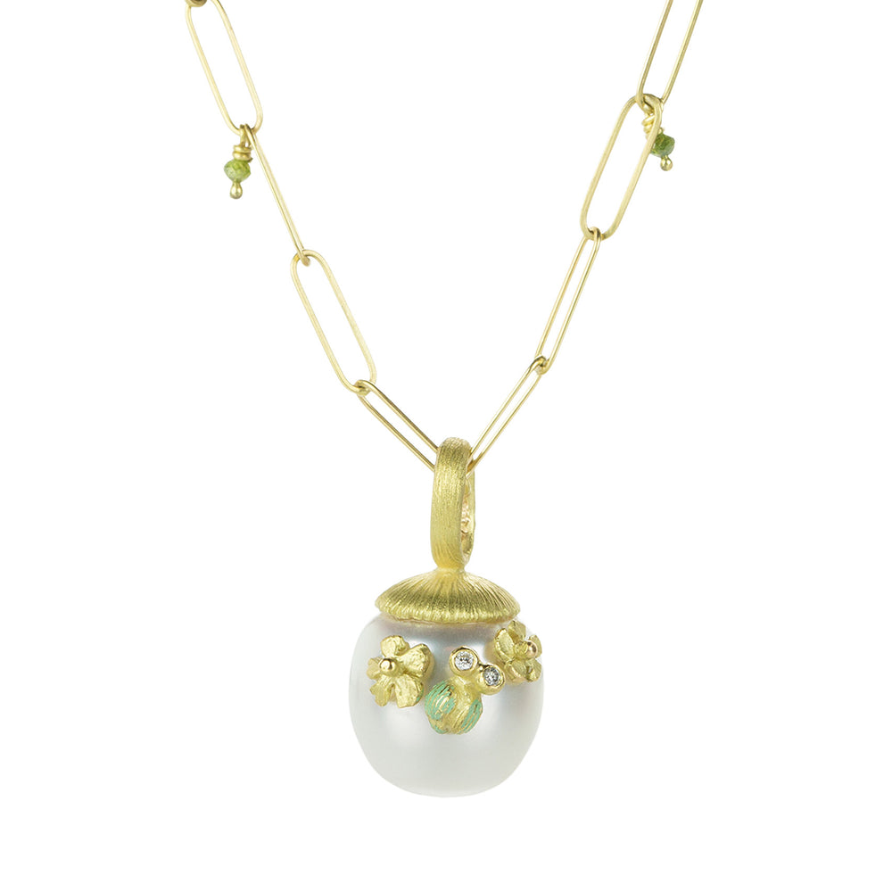 Whimsy and wanderlust comes to mind in this delightful 18k yellow gold pendant from Lene Vibe. A white South Sea pearl with a lovely cluster of carved floral elements is accented with a delightful diamond-eyed ladybug with green enamel wings. Total length measures 7/8” including the bail. Pendant only, chain is sold separately. Handcrafted in Denmark.