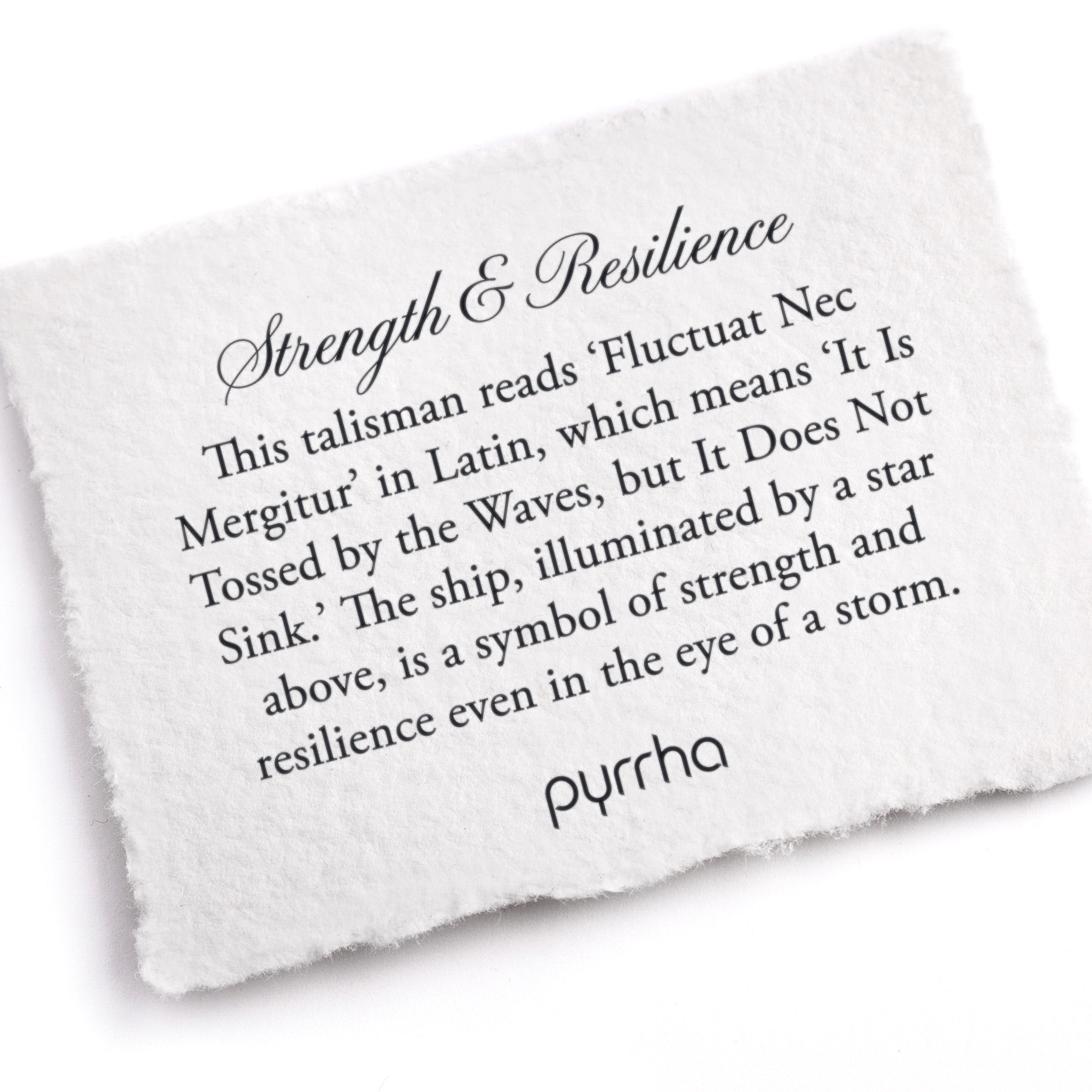 The ship in this Pyrrha pendant, illuminated by a star above, is a symbol of strength and resilience even in the eye of a storm. The talisman reads 'Fluctuat Nec Mergitur' in Latin, which means 'It Is Tossed by the Waves, but It Does Not Sink.' Lovingly and sustainably cast in sterling silver, this potent talisman hangs on a 22" fine medium curb chain with lobster clasp. Consider adding a Pyrrha attraction charm to this piece for an extra layer of color and meaning. Handcrafted in Vancouver, Canada.