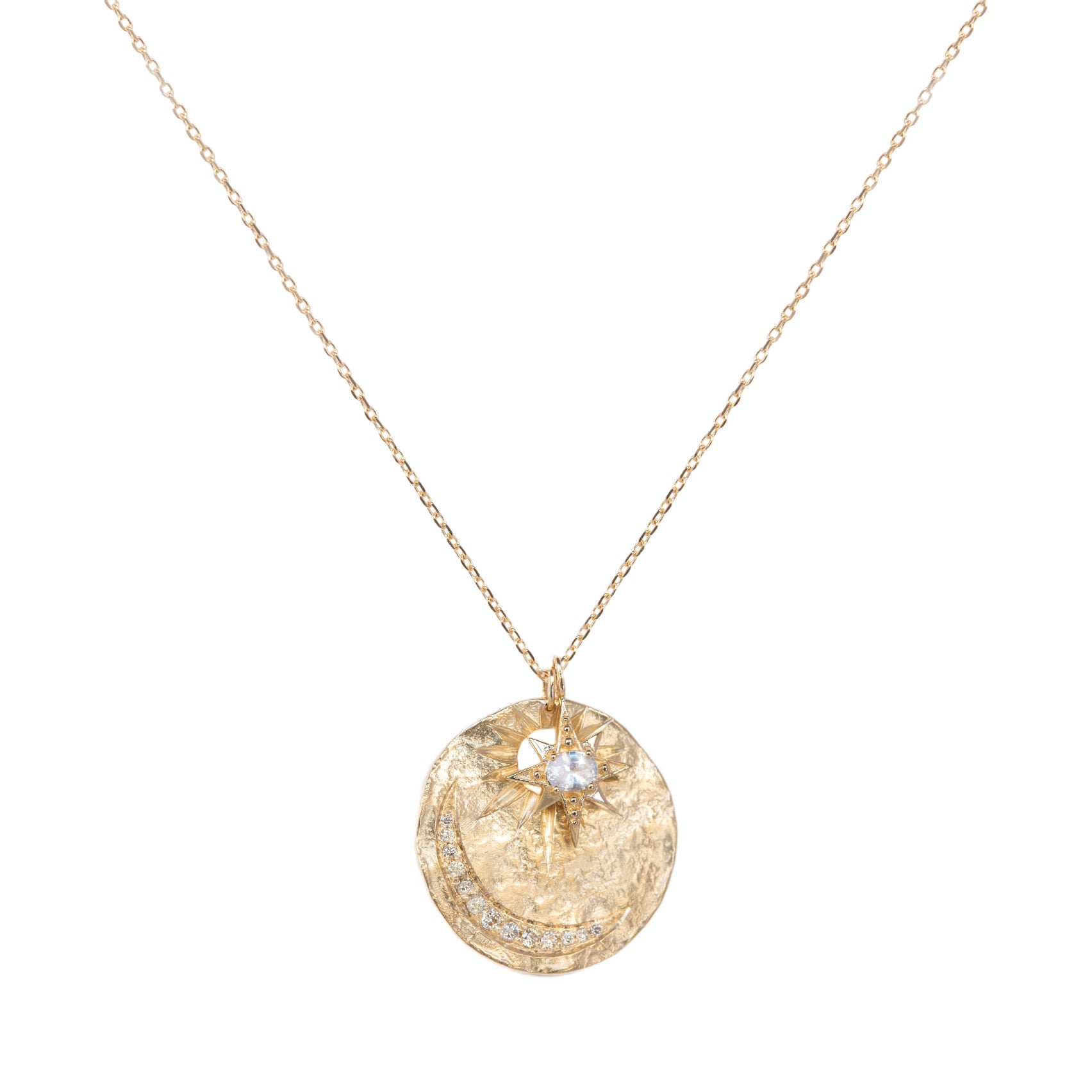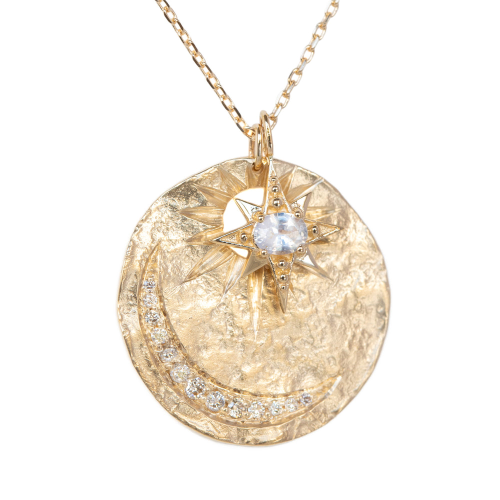 A 14k yellow gold chain with a sun and moon disc pendant set with white diamonds totaling 0.13ct and a starburst pendant set with a 0.22ct white sapphire. Disc measures 7/8" on a chain that can be worn at 16", 17" or 18". Handcrafted in Belgium