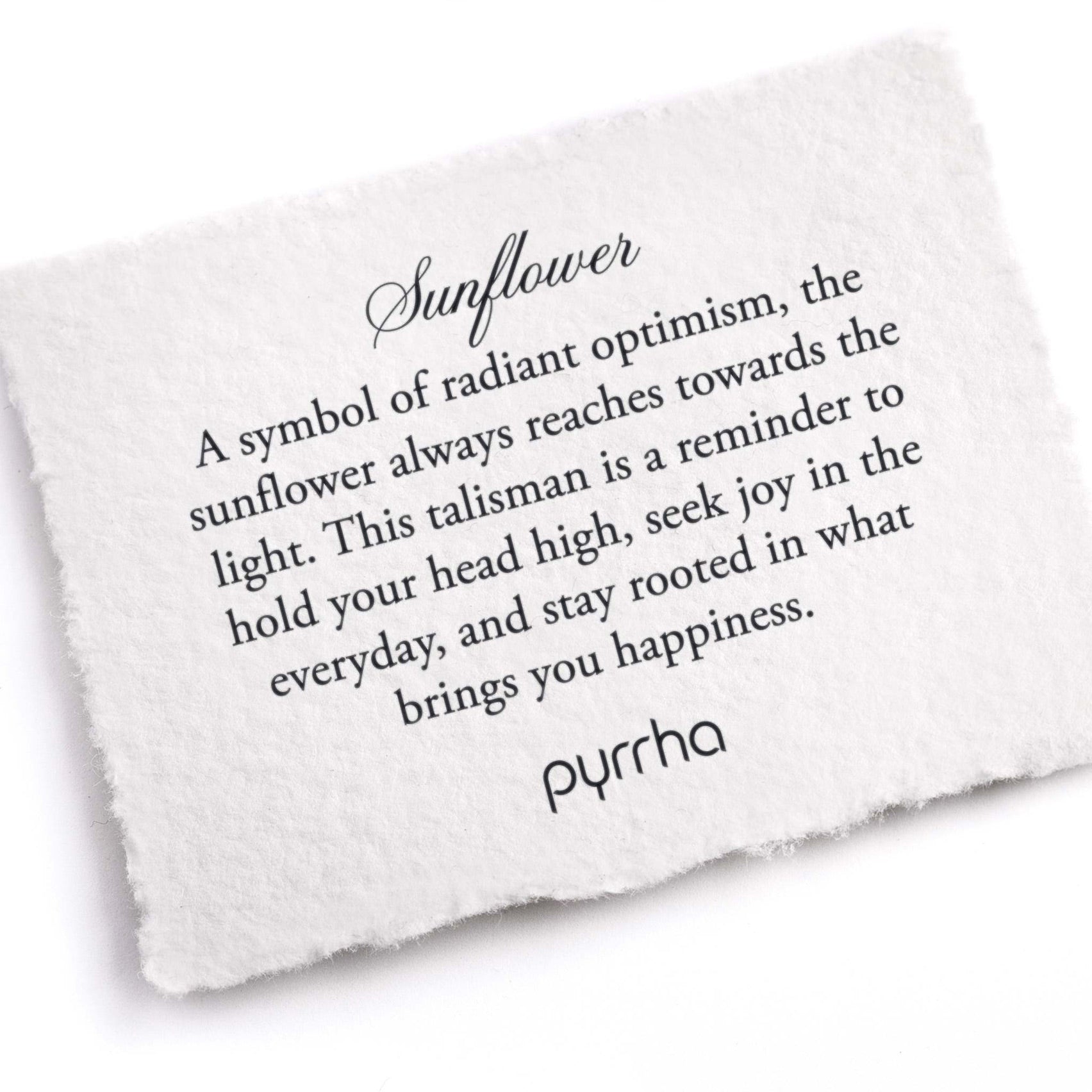 A symbol of radiant optimism, the sunflower in this Pyrrha pendant always reaches towards the light. It serves as a reminder to hold your head high, seek joy in the everyday, and stay rooted in what brings you happiness. Lovingly and sustainably cast in sterling silver, this potent talisman hangs on an 18" fine chain with lobster clasp. Consider adding a Pyrrha attraction charm to this piece for an extra layer of color and meaning. Handcrafted in Vancouver, Canada.