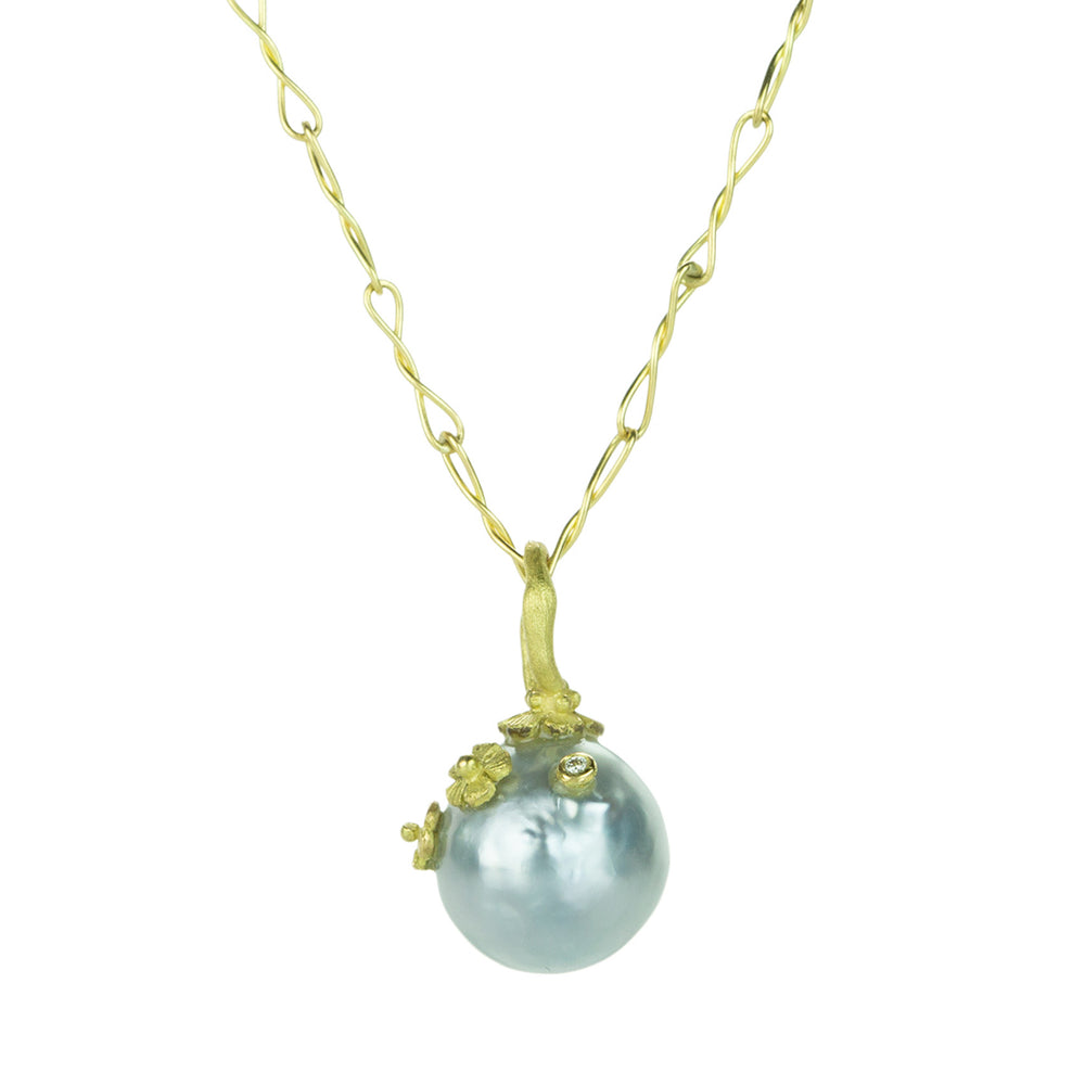 Little lights up a soul better than flowers and pearls. This 18k yellow gold pendant from Lene Vibe organically combines the two with a Tahitian pearl and two carved flowers with a bezel set 0.01ct white diamond. Total length measures 7/8“ including bail. Pendant only, chain is sold separately. Handcrafted in Denmark.