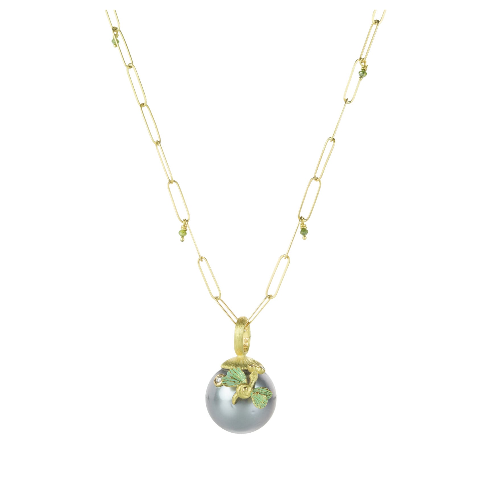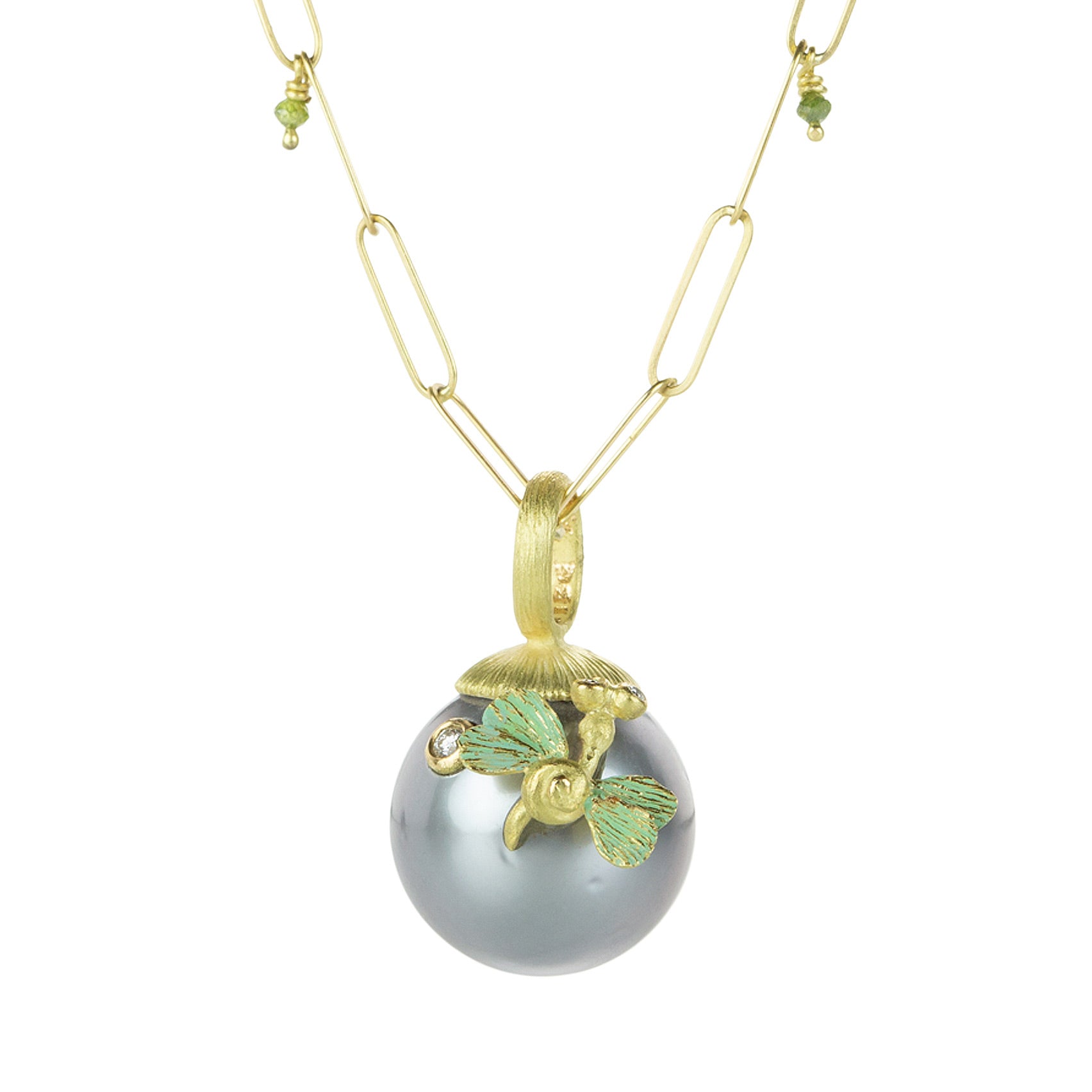 Display your affinity for the sea and all the earth’s creatures in this uniquely detailed 18k yellow gold pendant from Lene Vibe. A light gray Tahitian pearl is dressed with a carved cap and a whimsical critter with green enamel wings. A bezel set 0.05ct white diamond adds a spark. Total length measures 1" including the bail. Pendant only, chain is sold separately. Handcrafted in Denmark.