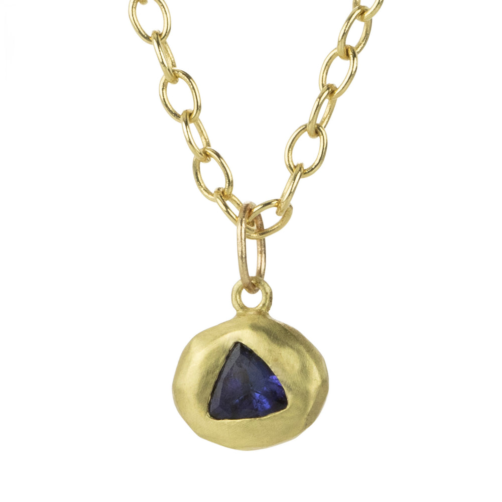 Keep it rockin’ in a delightfully organic pebble pendant from Fannie Thomas! Crafted in 18k yellow gold, this hand carved pendant features a 0.75ct trillion cut tanzanite in the center with a softly brushed finish. Pendant length measures approximately 3/4" including bail. Pendant only, chain is sold separately. Handcrafted in San Antonio, TX, U.S.