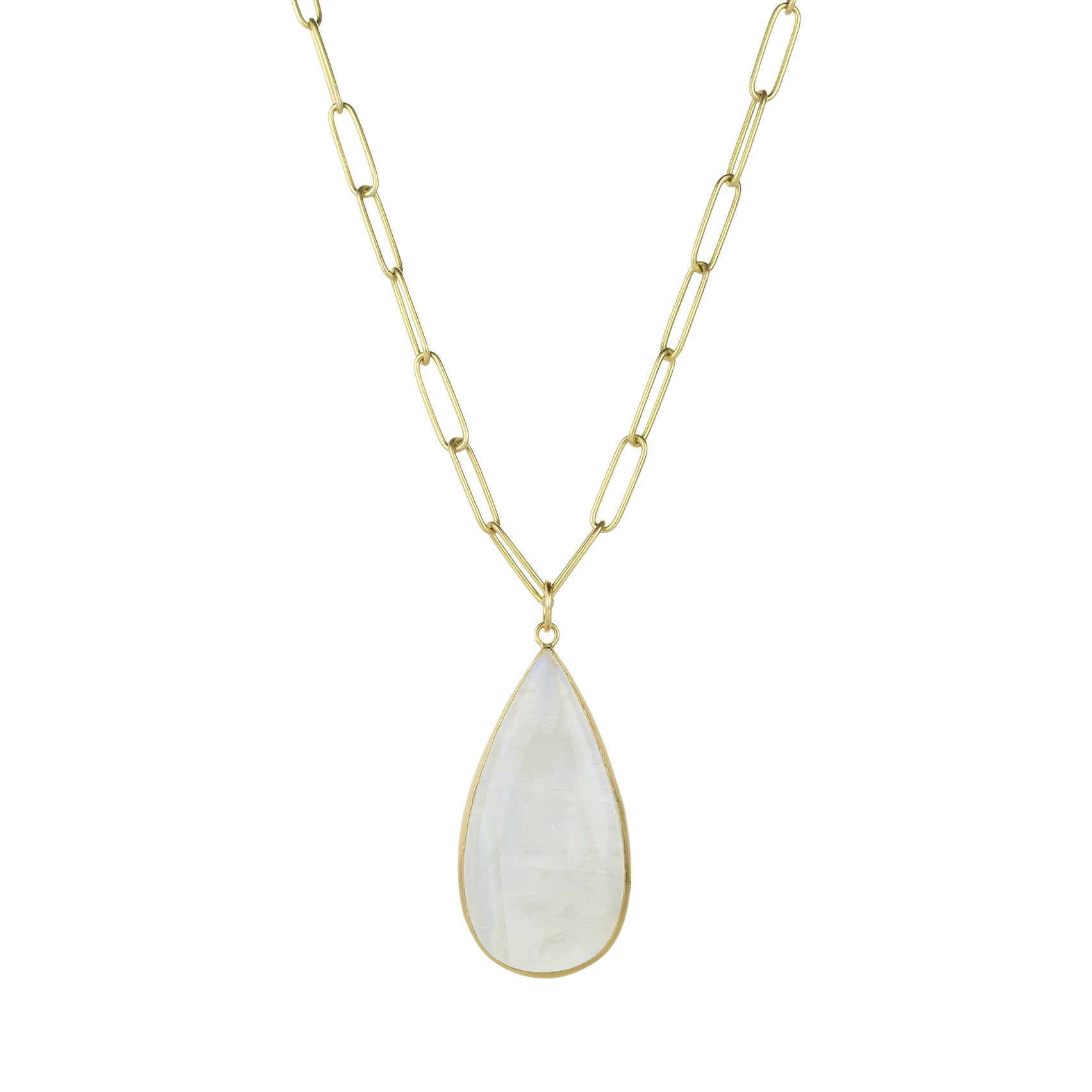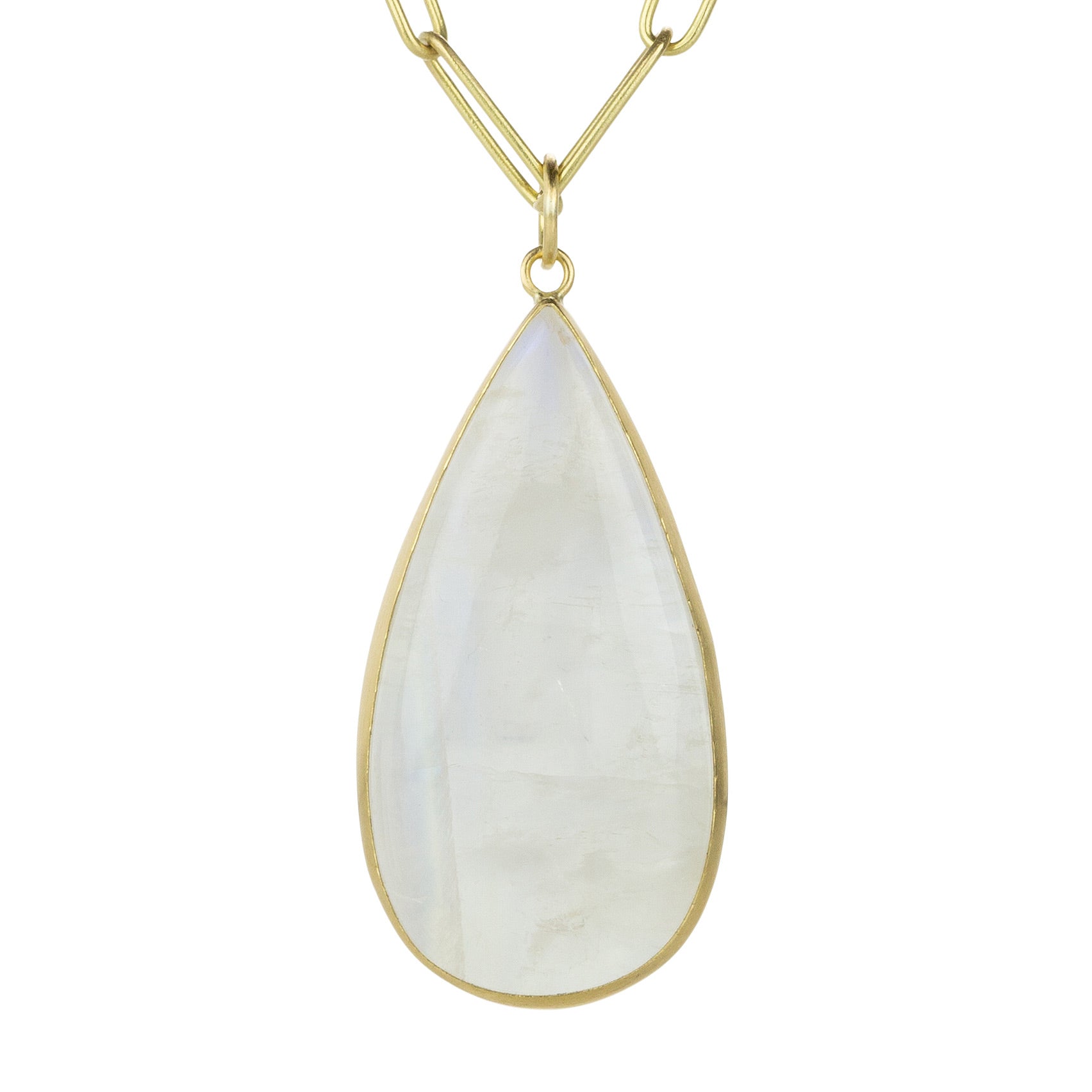 A large, smooth teardrop moonstone cabochon is lovingly bezel set in 18k yellow gold by Maria Beaulieu. This pendant’s natural beauty is allowed to shine in its minimalist setting, with wonderful flashing color. A mutable, versatile stone, moonstone channels feminine energy and the goddess within. Pair it with one of the artist’s coveted handmade chains to complete the designer look. Pendant length measures 1 5/8” including the bail. Chain is sold separately. Handcrafted in Brooklyn, NY, U.S.