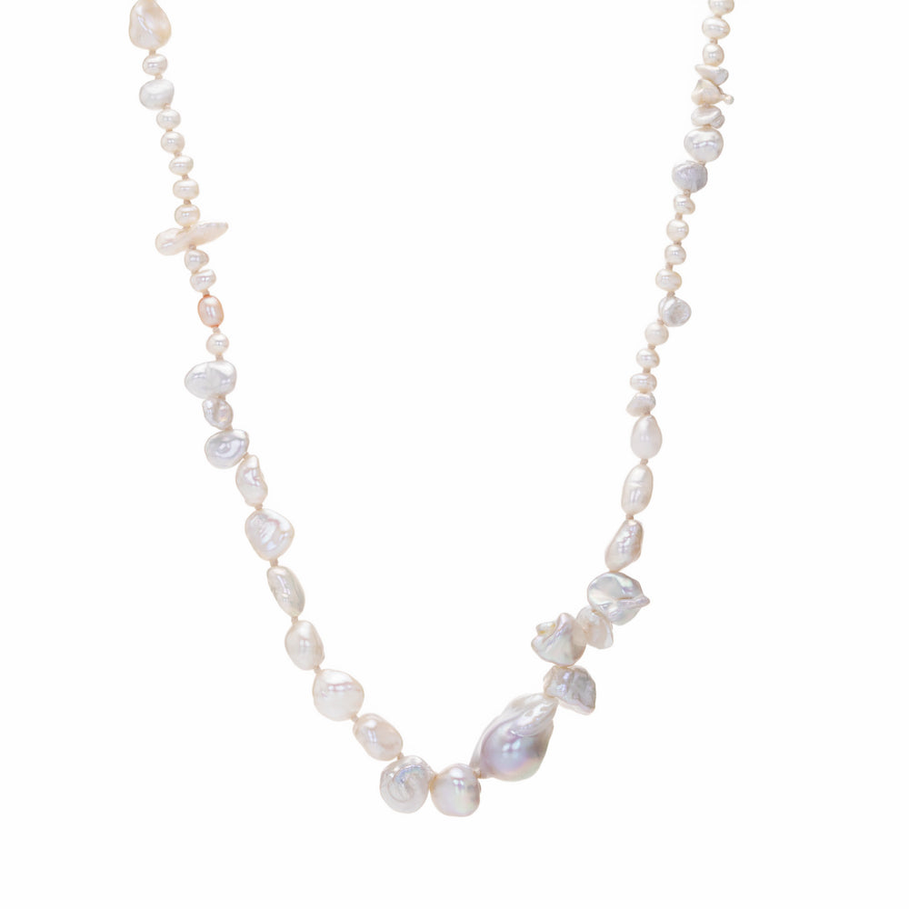 A treasure from the sea to behold, this shimmering necklace from Lena Skadegard has a light all its own. White and gray Japanese pearls are thoughtfully arranged and hand knotted for a luxurious drape. Total length with a 9k yellow gold hook & eye clasp measures 20”. Handcrafted in Denmark.