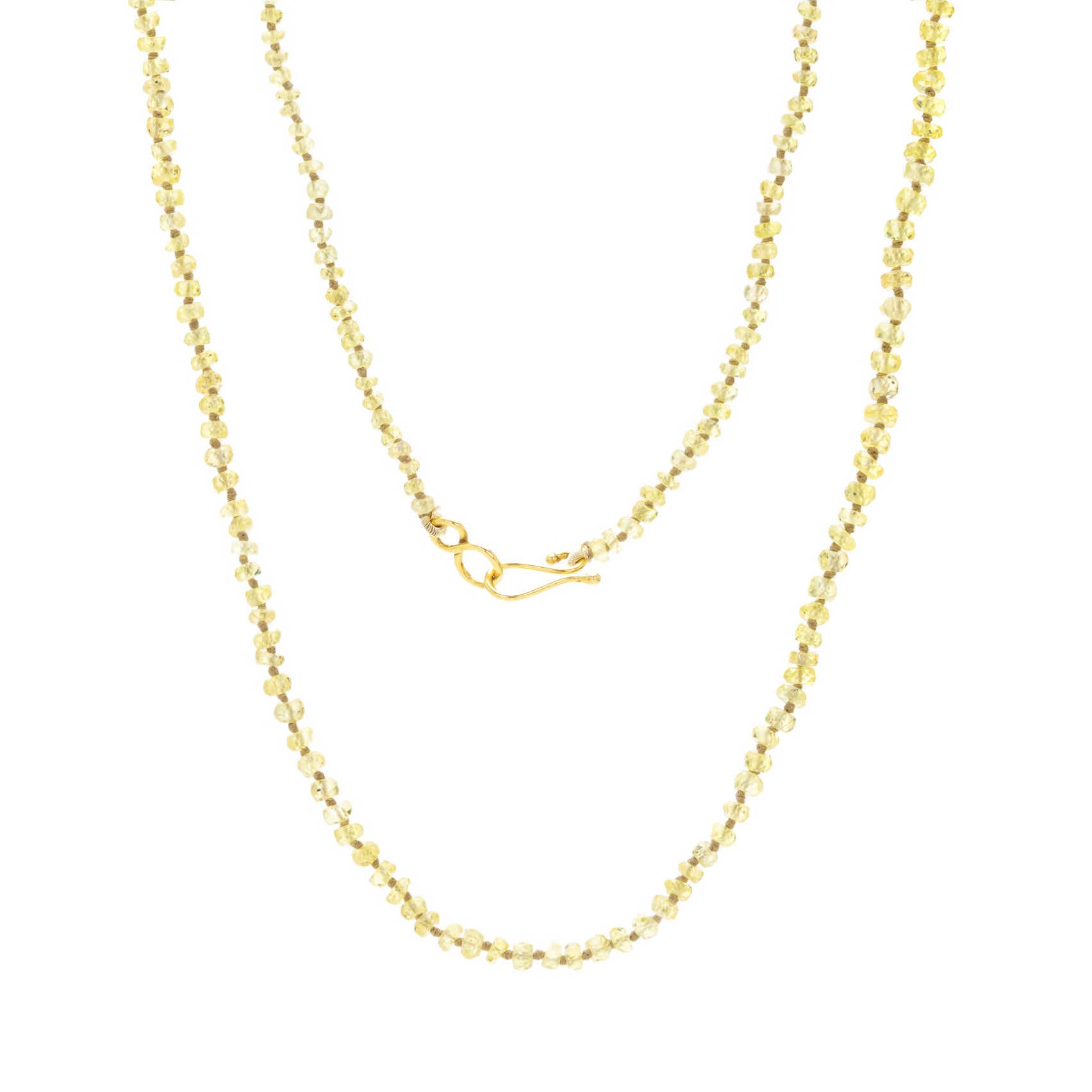 Infuse a longer layer of luscious gemstone sparkle to your look in this simply elegant beaded necklace from Lena Skadegard. Faceted yellow sapphire beads find the light in a hand knotted arrangement with lovely drape. Total length with a 9k yellow gold hook clasp measures 25". Handcrafted in India.