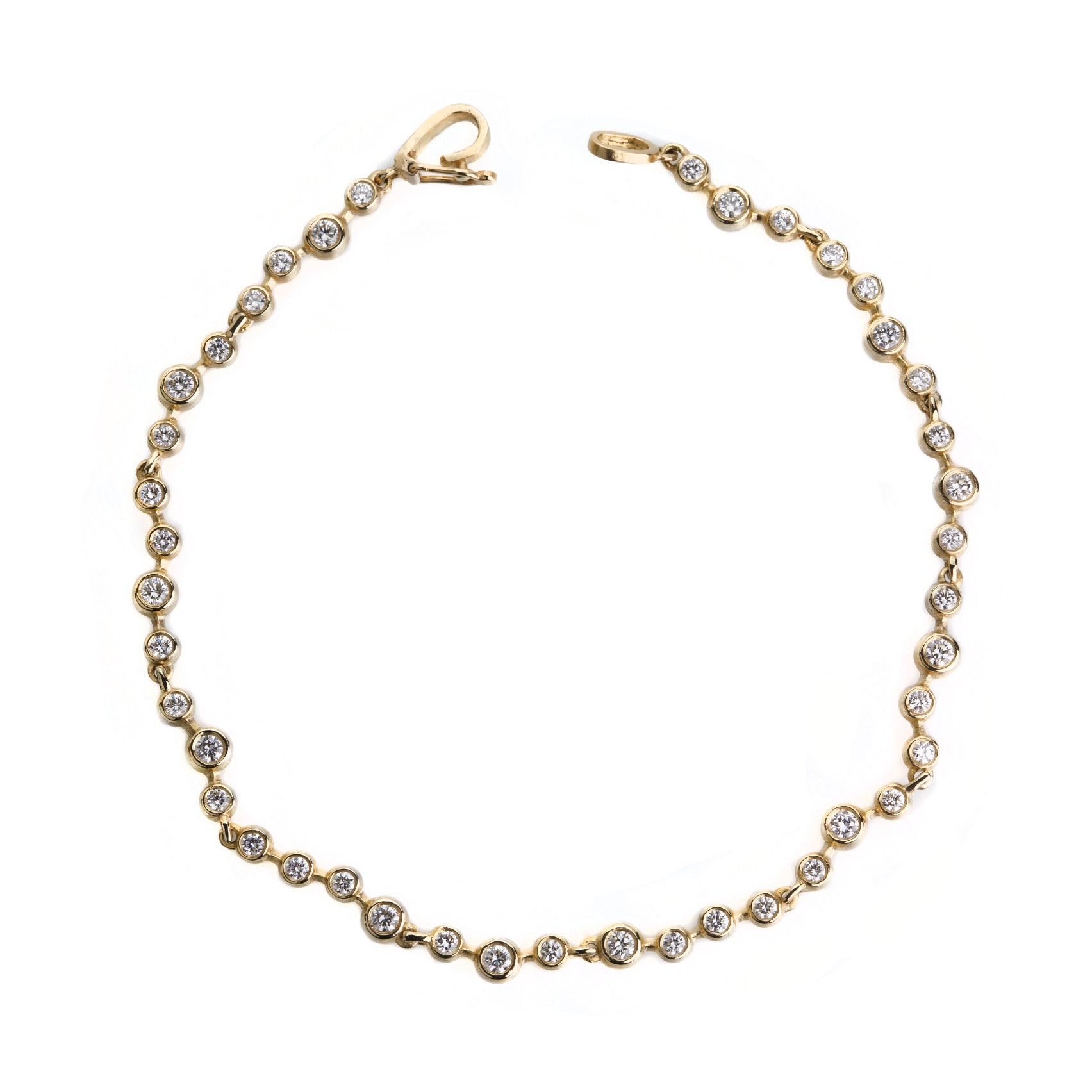 If you’ve ever wished for a river to skate away on, consider it granted! This 14k yellow gold bracelet from Nicole Landaw features bend after bend of white faceted diamonds totaling 1.40cttw. Total length measures 7 5/8” with a locking hook and eye clasp. Handcrafted in Hudson River Valley, NY, U.S.