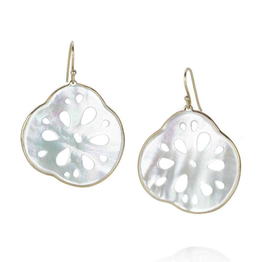 Find peace in your jewelry box and throughout your day. This pair of 14k yellow gold earrings from Annette Ferdinandsen features carved mother of pearl lotus root drops. These earrings are a perfect expression of the beauty and simplicity found in nature, with a casual, coastal vibe. Total length with curved ear wires measures 1 1/4". Handcrafted in Hudson Valley, NY, U.S.