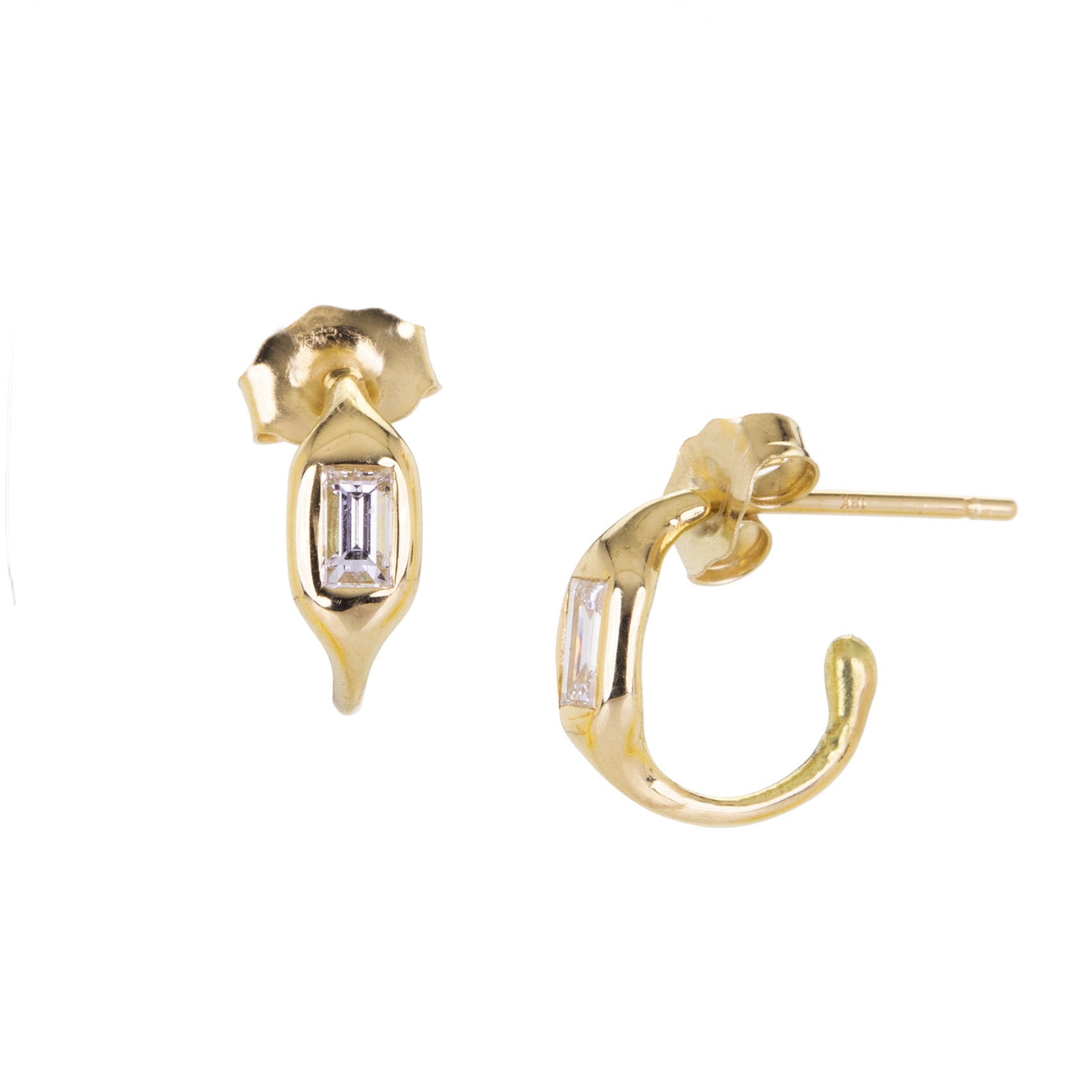 Perfectly petite, this charming pair of 18k yellow gold huggies from Diana Mitchell features baguette shaped diamonds totaling 0.30cttw. Huggies measure 3/8" x 3/8". Handcrafted in Brooklyn, NY, U.S.