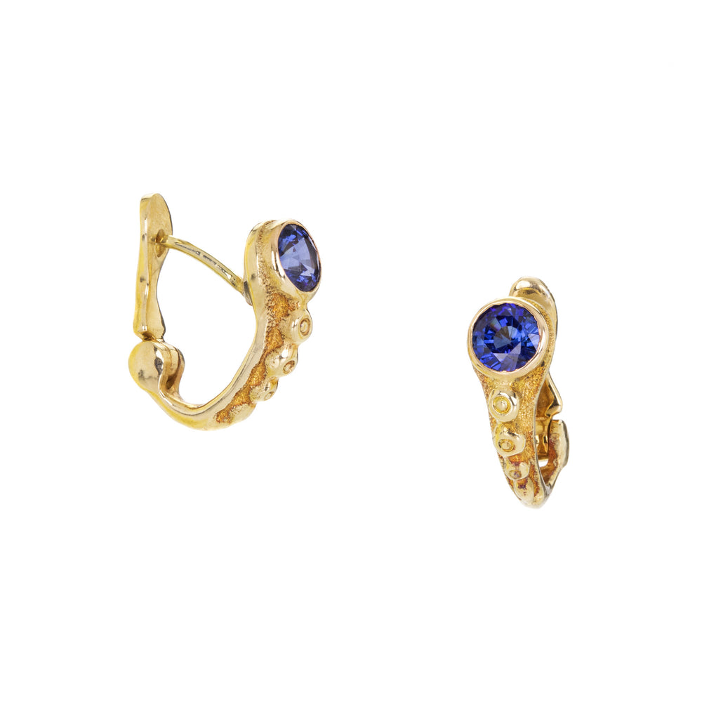 This perfectly petite pair of organic 18k yellow gold huggies from Audrius Krulis will become your new everyday faves. White diamonds add the sparkle, while blue sapphires totaling 0.50cttw add the color pop. Total length measures approximately 1/2”. Handcrafted in Montrose, NY, U.S.