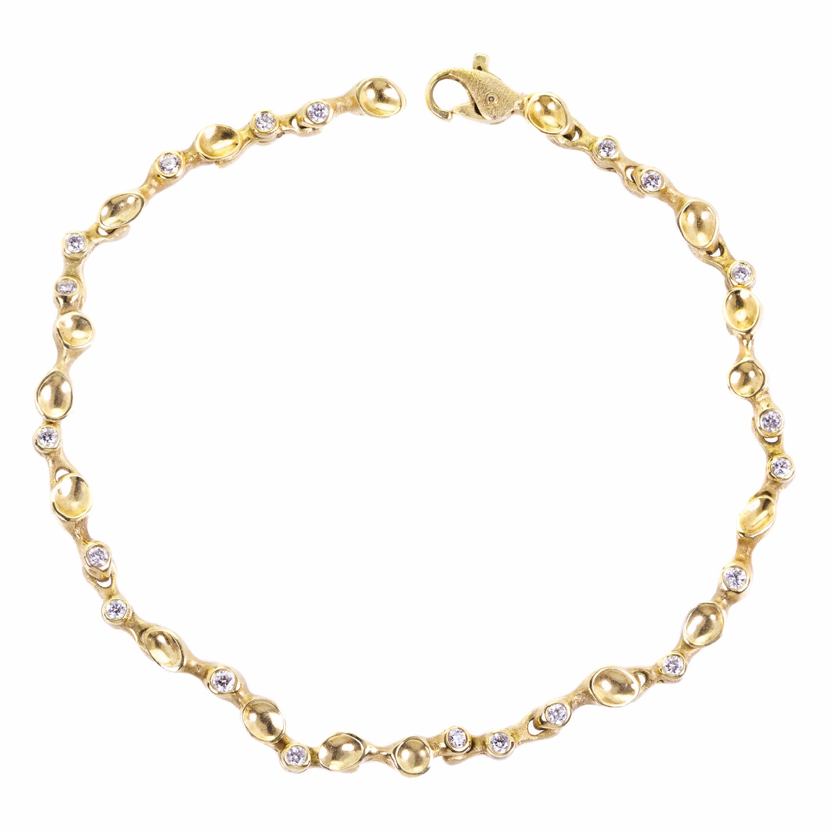 Twenty bezel set white diamonds totaling 0.40cttw sparkle like sun on the water in this 18k yellow gold bracelet from Audrius Krulis. The flowing, organic form features luxurious pod-like depressions and satiny texture. Total length with lobster clasp measures 7 3/4". Handcrafted in Montrose, NY, U.S.
