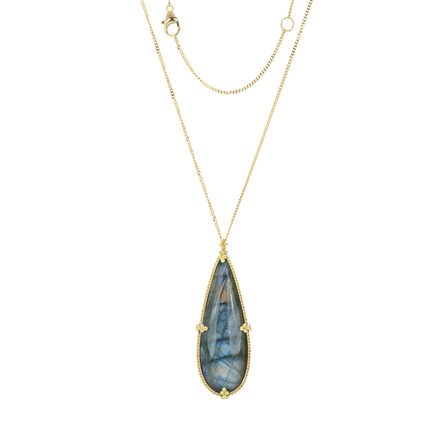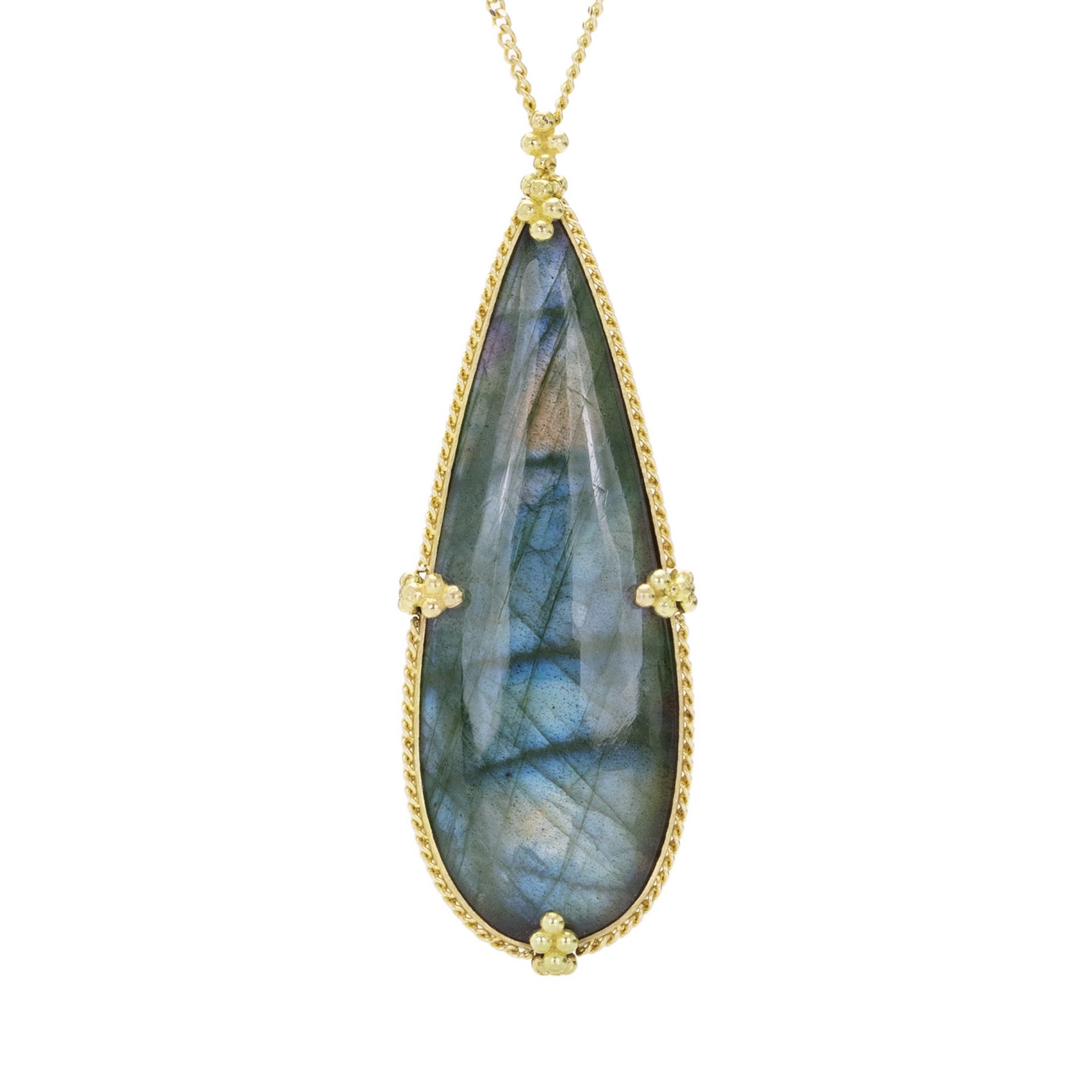 Dress up your days (and nights!) with this brilliant labradorite necklace by Amali. The elongated 24.7ct pear shaped cabochon is framed by an 18k yellow gold bezel with tiny ball prongs, creating a look of old world refinement. This piece looks great next to anything it touches! Pendant measures 1 3/4" including bail. Total necklace length measures 16”-18” adjustable with lobster clasp. Handcrafted in New York, NY, U.S.