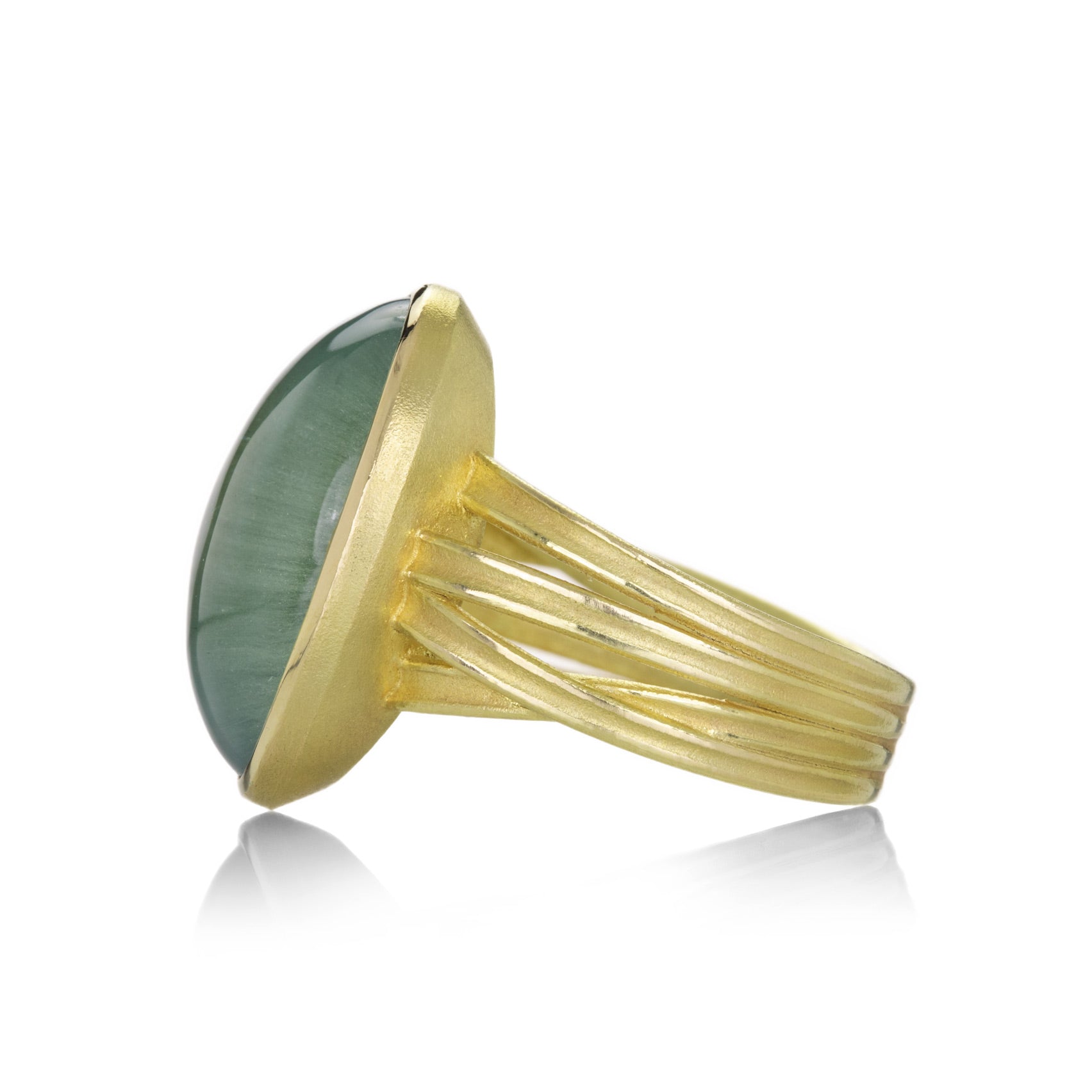 With four flowing ribbons of 18k yellow gold encircling a 15.79ct oval aquamarine cabochon, this Barbara Heinrich ring is a poetic ode to the ocean. The stone is as mysterious and deep as the water its name honors. Size 7.75. Handcrafted in Rochester, NY, U.S.