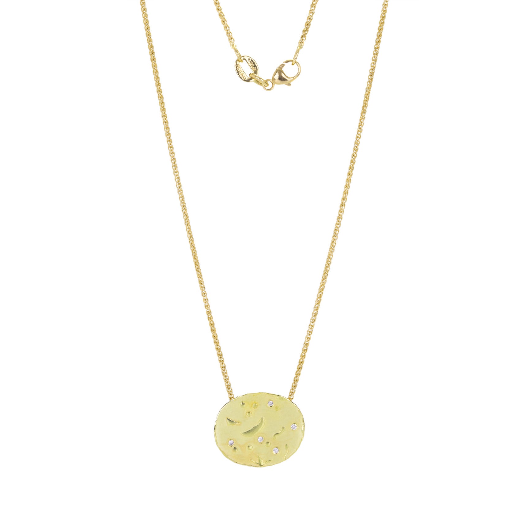 A universe of possibility awaits! This 18k yellow gold necklace from Barbara Heinrich features an organically oval shaped disc pendant with five surface set white diamonds. Pendant measures 5/8“ wide. Total spiga chain length with lobster clasp measures 17". Handcrafted in Rochester, NY, U.S.