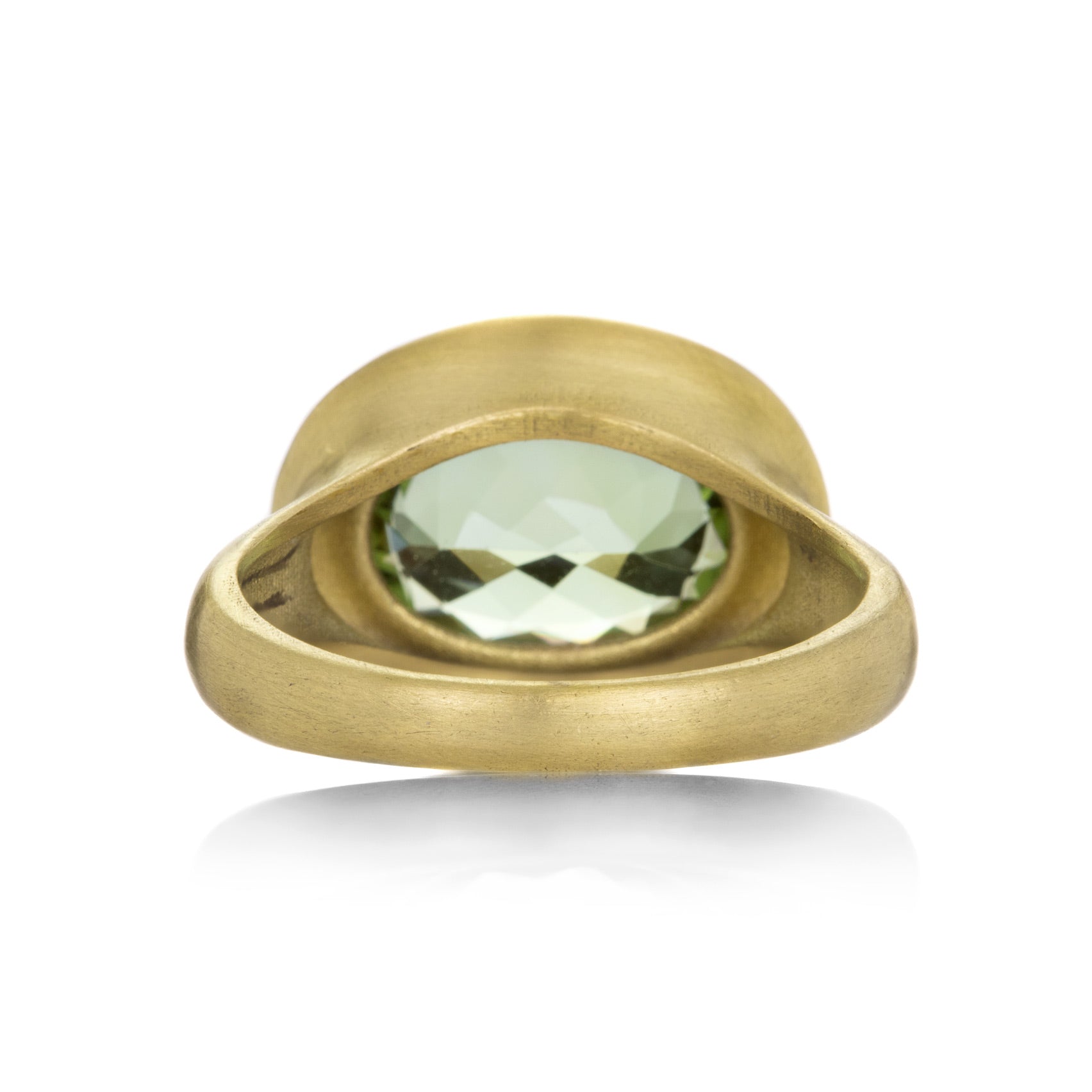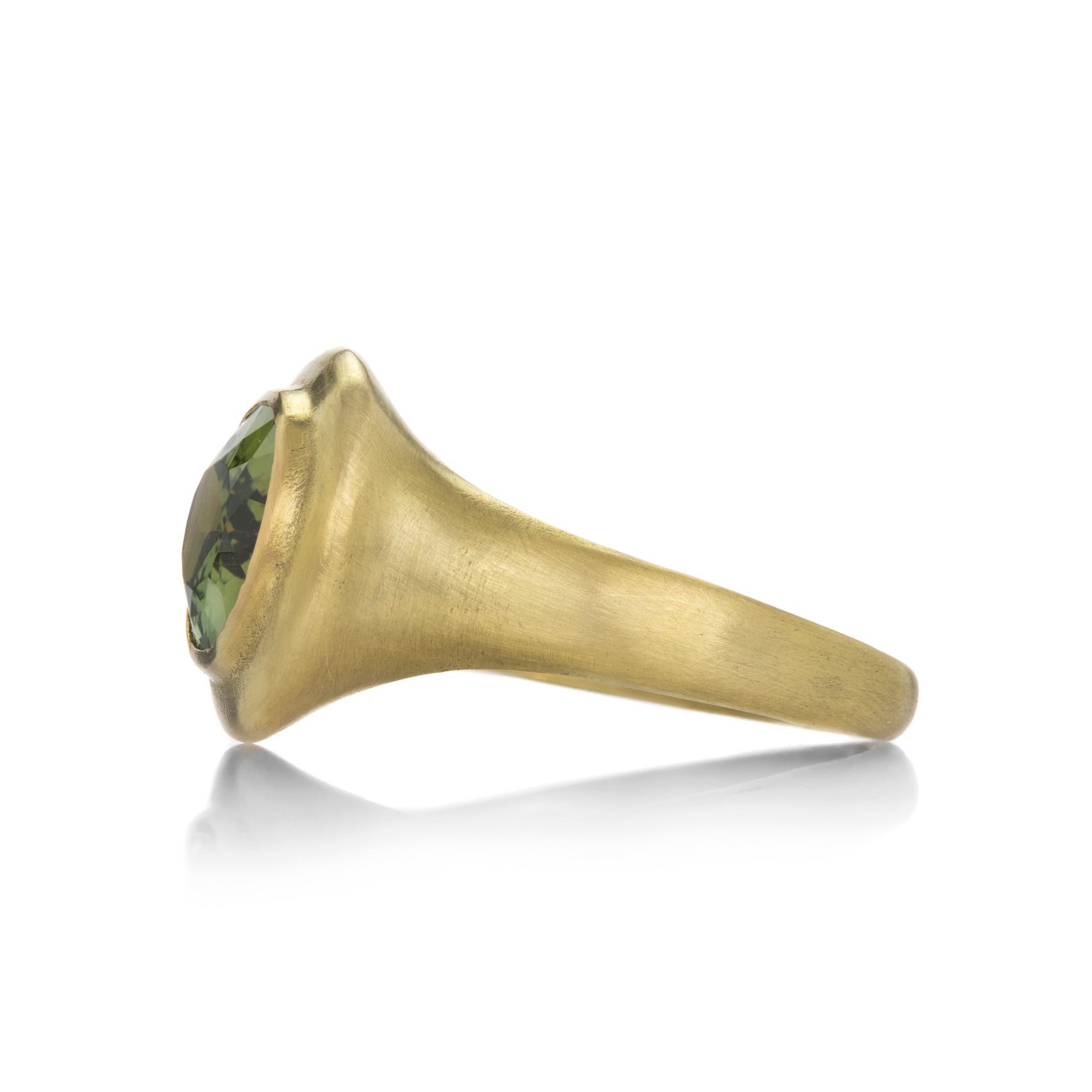 Cherish a modern relic in this Greek inspired, 22k yellow gold ring from Rosanne Pugliese. A bright, faceted oval green tourmaline is set east-west in a smooth tiered bezel. The beautiful brushed band softly tapers from front to back. Size 6.5. Handcrafted in Brooklyn, NY, U.S.