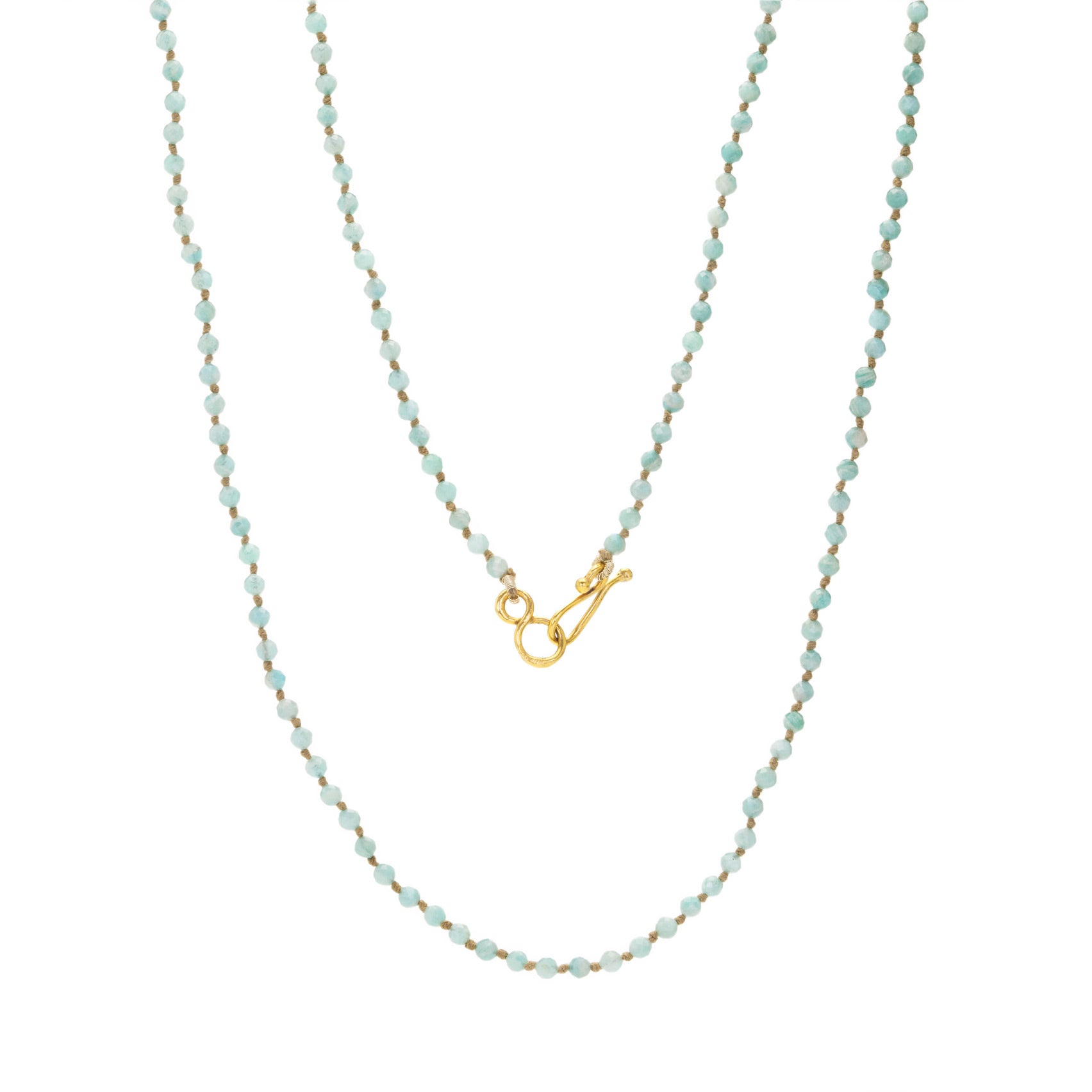 Infuse a long layer of luscious gemstone sparkle to your look in this simply elegant beaded necklace from Lena Skadegard. Faceted amazonite beads find the light in a hand knotted arrangement with lovely drape. Total length with a 9k yellow gold hook clasp measures 30". Handcrafted in India.