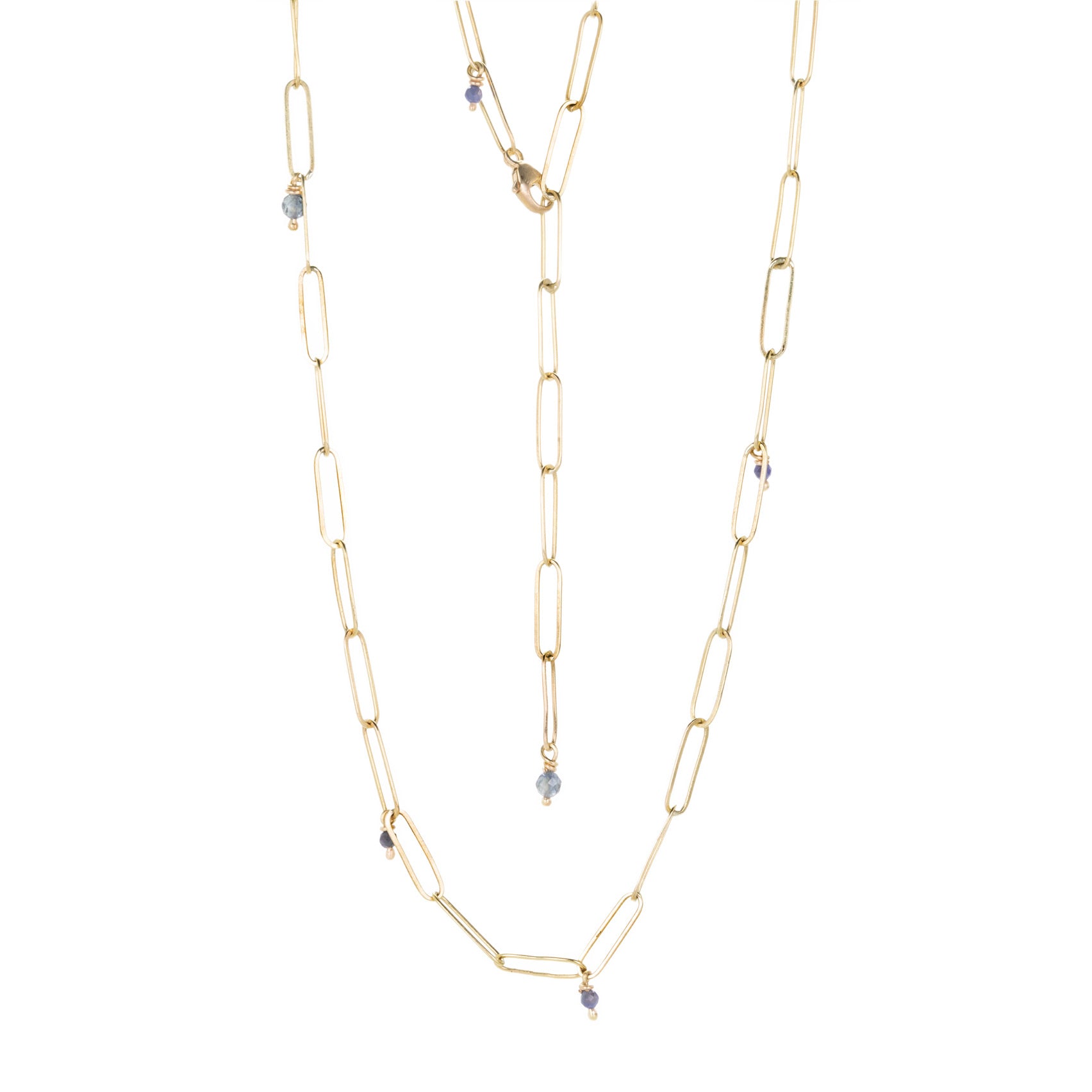 Layer on the links in this 18k yellow gold popsicle chain necklace from Lene Vibe. Faceted blue sapphire beads twinkle and chime at various stations along the hand formed links. Total length with lobster clasp measures 35 1/4”. Handcrafted in Denmark.