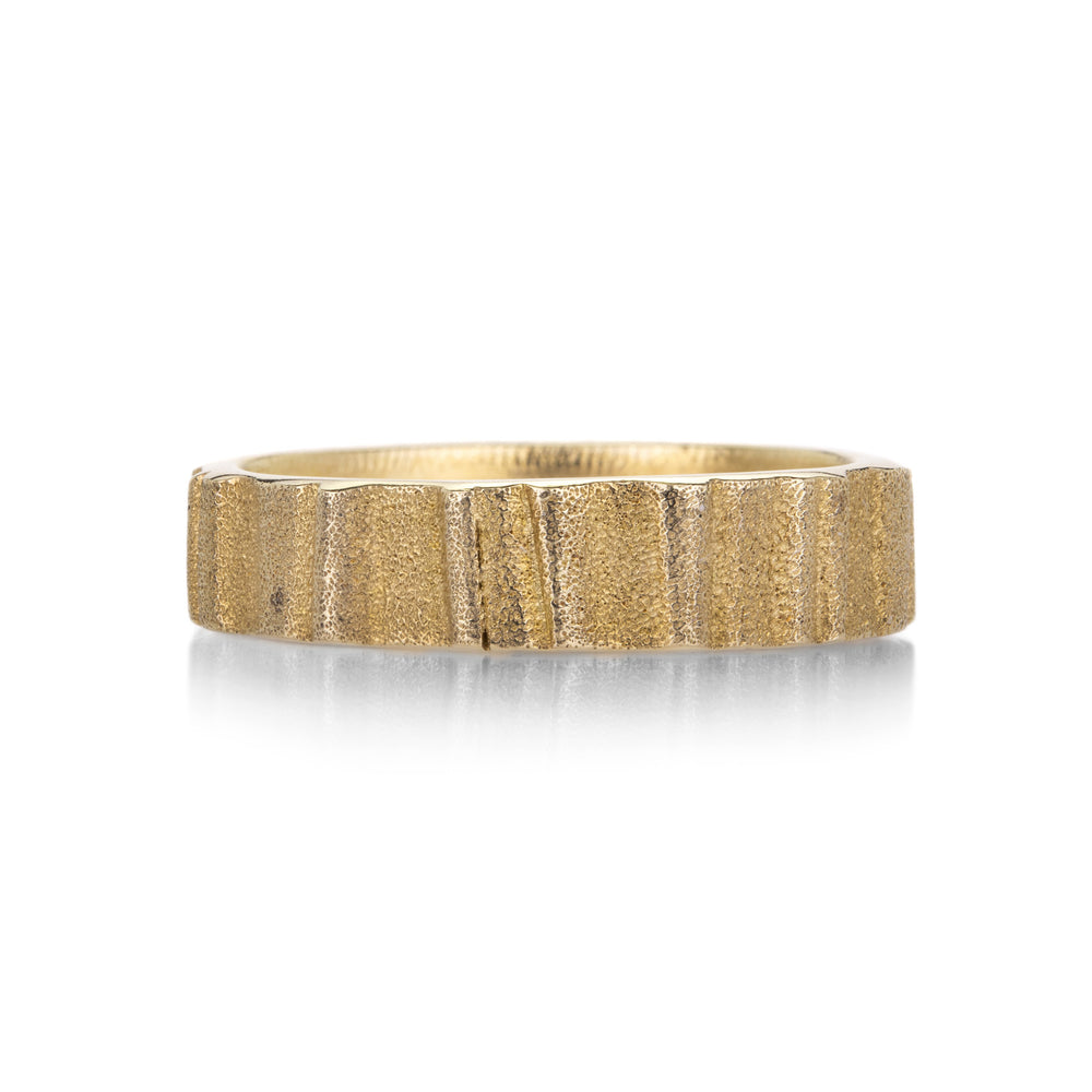 This finely crafted men’s wedding band from Audrius Krulis is rugged yet refined in 18k yellow gold. A heavily textured outer texture surface gives way to a smooth, comfortable inner side. Band width measures approximately 5.5mm. Size 9.75. Handcrafted in Montrose, NY, U.S.
