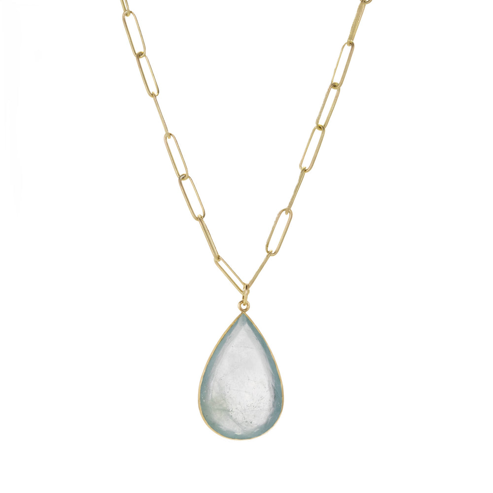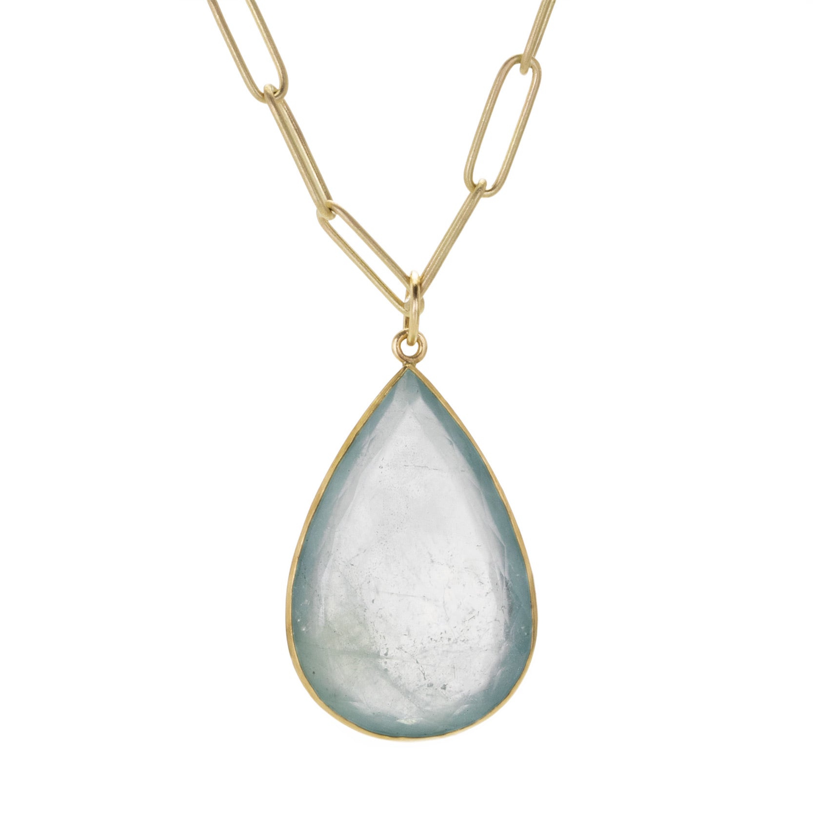 This pale, ethereal beauty from Maria Beaulieu is ready to become your own! A minimalist 18k yellow gold bezel holds a teardrop shaped aquamarine slab of the palest blue green. Stone measures 18 x 28mm. Pair it with your favorite chain or one of the artist's coveted handmade gold chains to complete the designer look! Pendant only, chain is sold separately. Handcrafted in Brooklyn, NY, U.S.