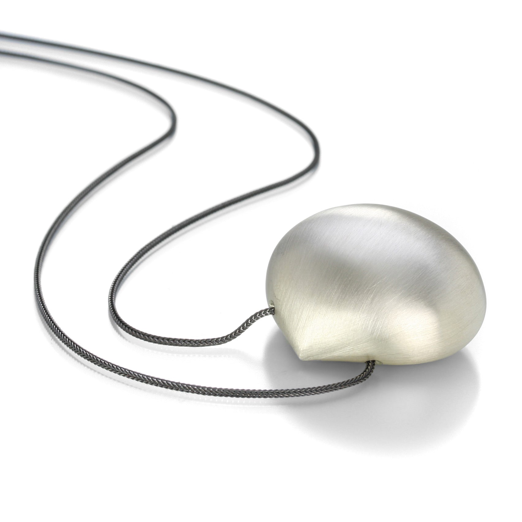 This Gabriella Kiss necklace features a sliding brushed sterling silver chestnut pendant that is all at once earthy and elegant. Strung on an oxidized sterling silver chain, this a a great layering piece. Or, wear it solo to make a singular statement. No matter how you wear it - it's purely gorgeous! Pendant measures approximately 3/4" x 3/4”. Chain length measures 30". Handcrafted in Hudson Valley, NY, U.S.