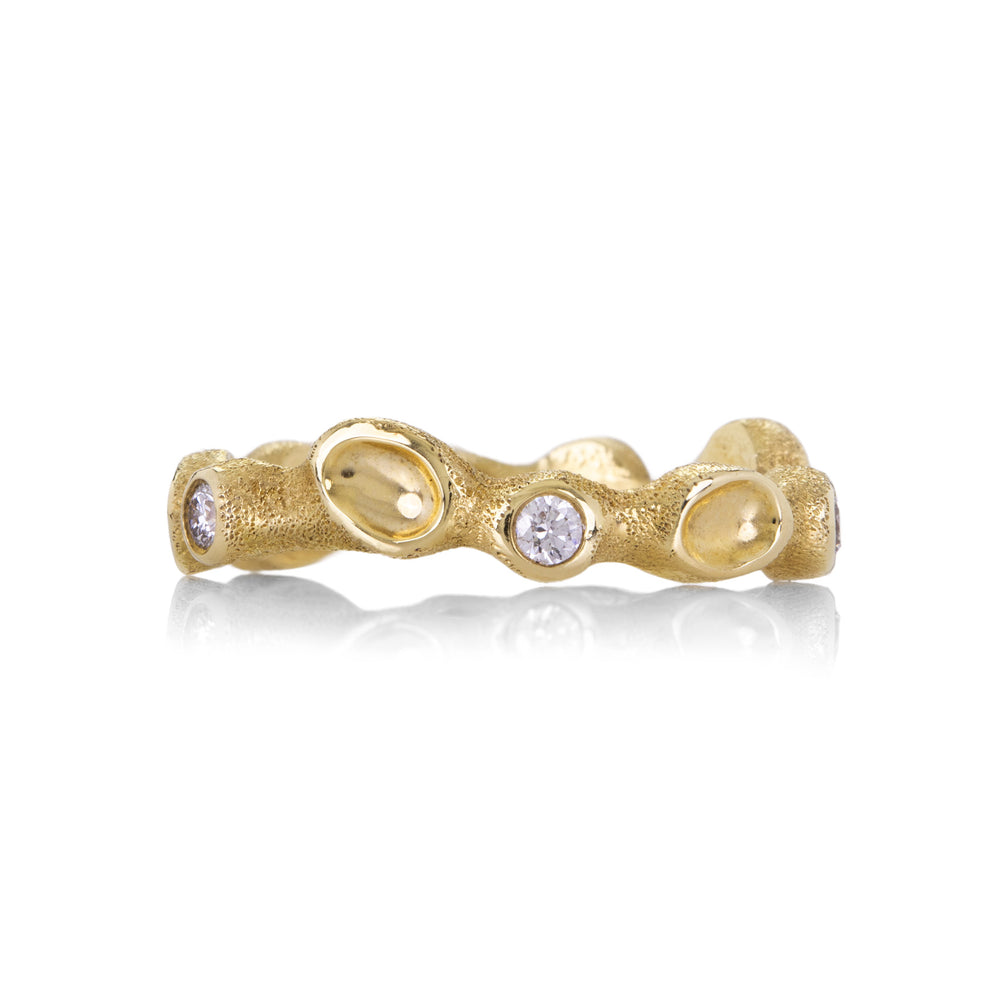 Curiously captivating, this 18k yellow gold band from Audrius Krulis features elegant pod-like depressions and shimmering white diamonds totaling 0.16cttw. A contrasting overall texture gives this piece a living coral feel. Band measures 4mm wide. Size 6. Handcrafted in Montrose, NY, U.S.