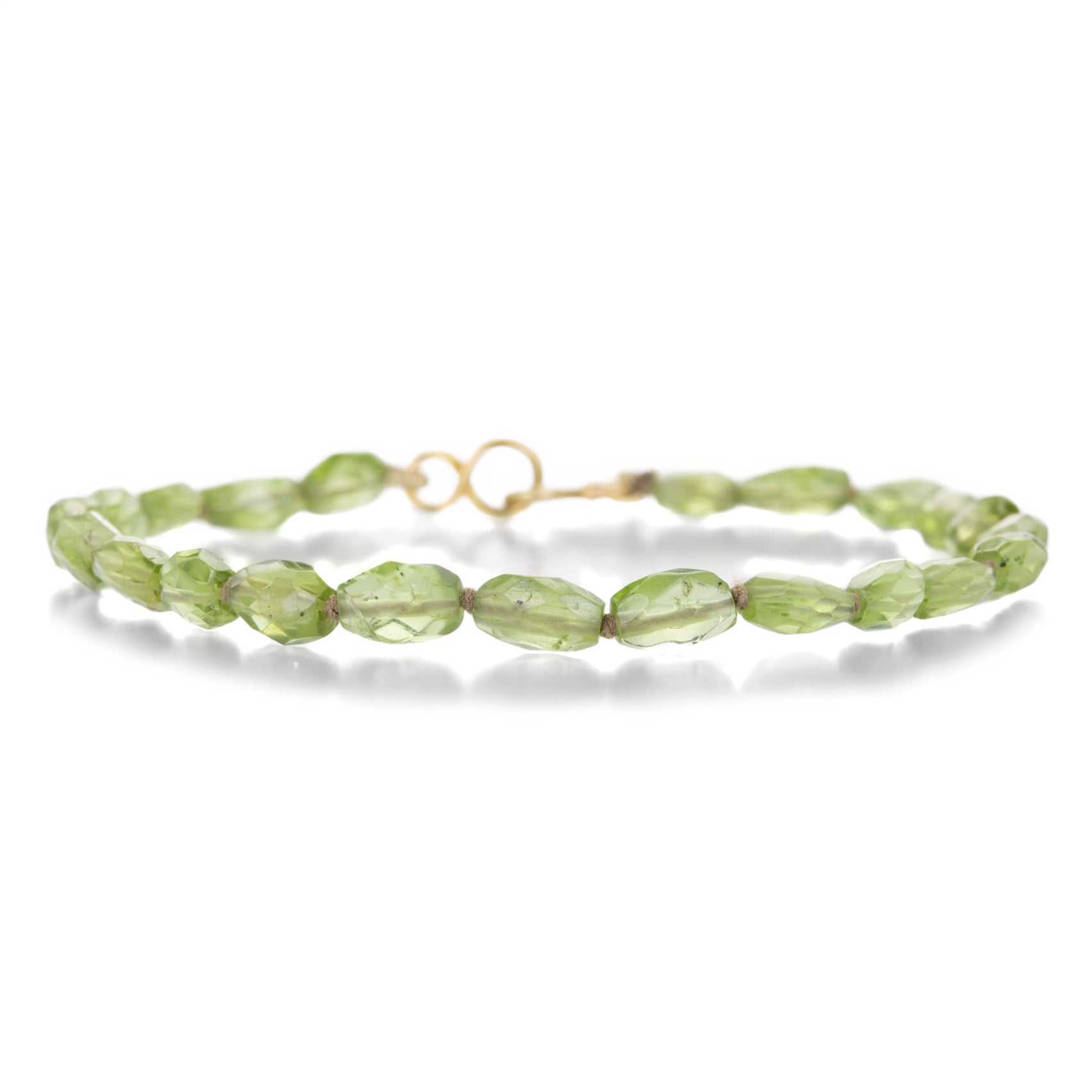 Bring a touch of luscious gemstone sparkle to your stack with this simply elegant beaded bracelet from Lena Skadegard. Faceted oval peridot beads find the light and a 9k yellow gold hook clasp sets this piece off. Total length measures 7". Handcrafted in India.