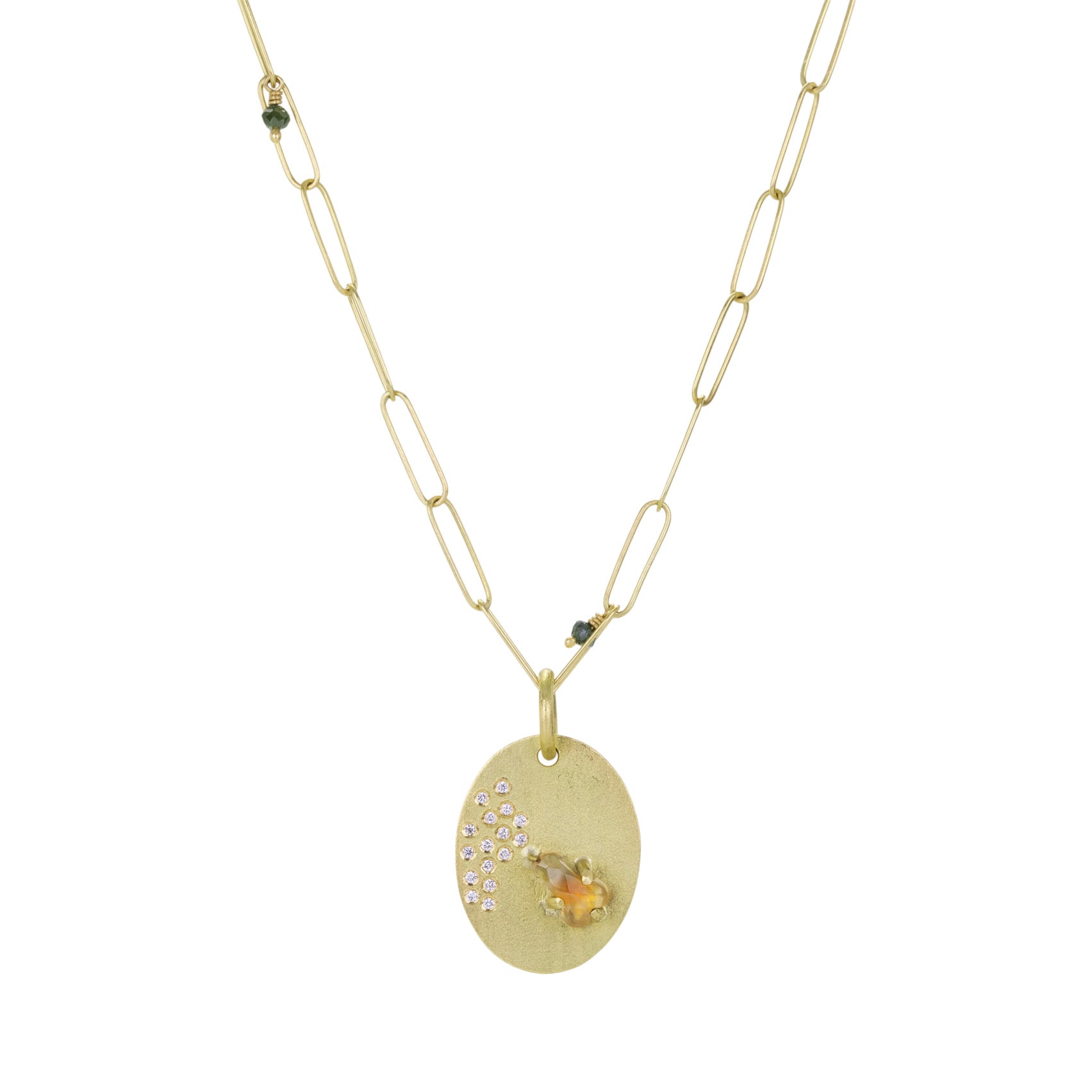 An 18k yellow gold disc with a carved, faceted 0.70ct sapphire and scattered white diamonds totaling 0.17ct. Total length measures 1". Handcrafted in Denmark.