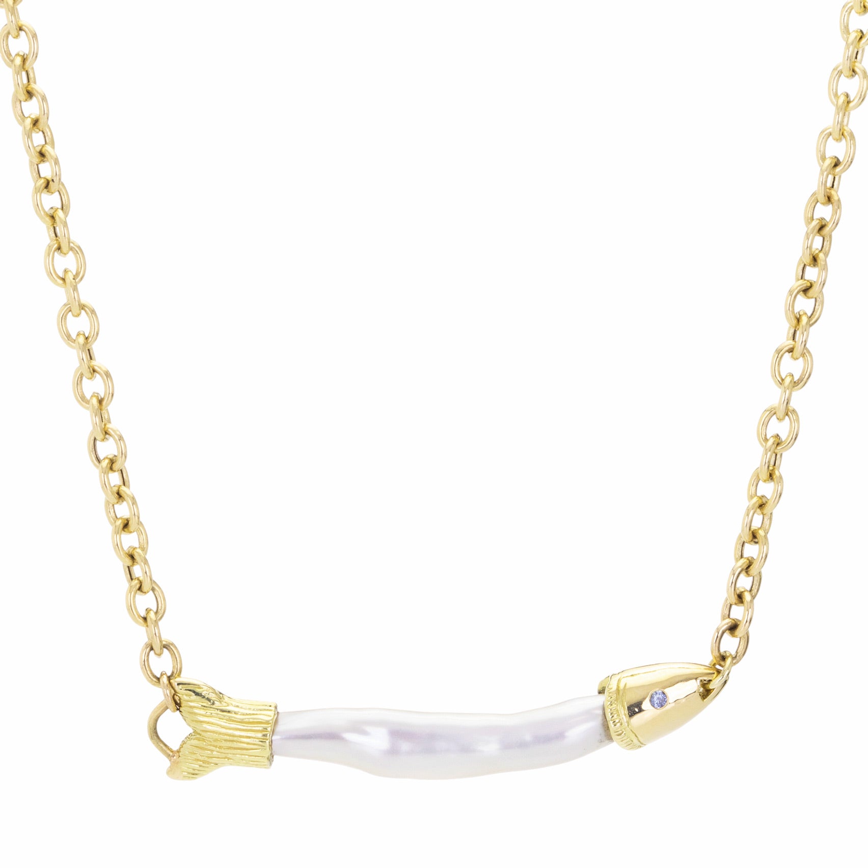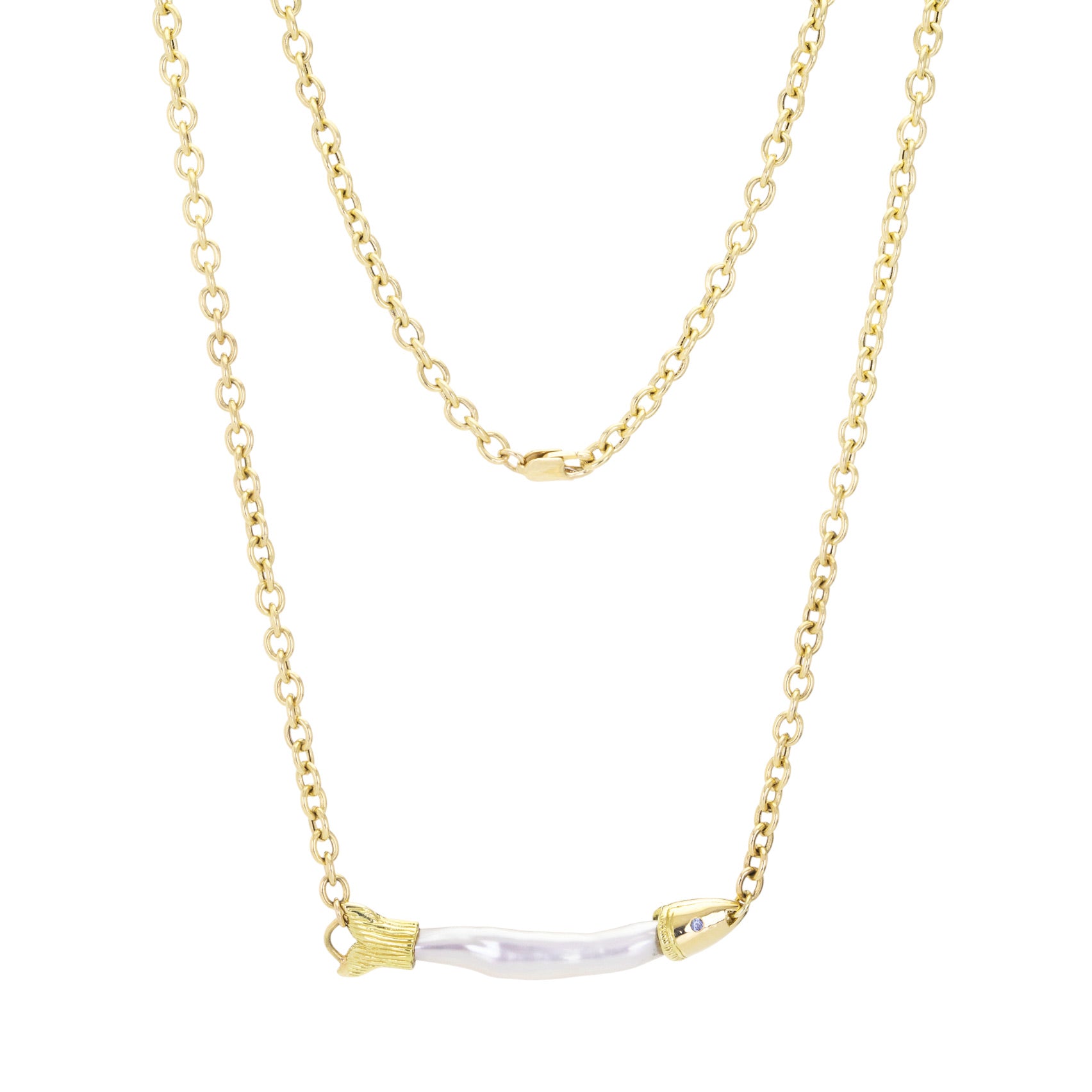 An 18k yellow gold, 3mm oval chain with a fish stick pearl pendant in the center with blue sapphire eyes. Total length measures 18". Handcrafted in San Antonio, TX, U.S.