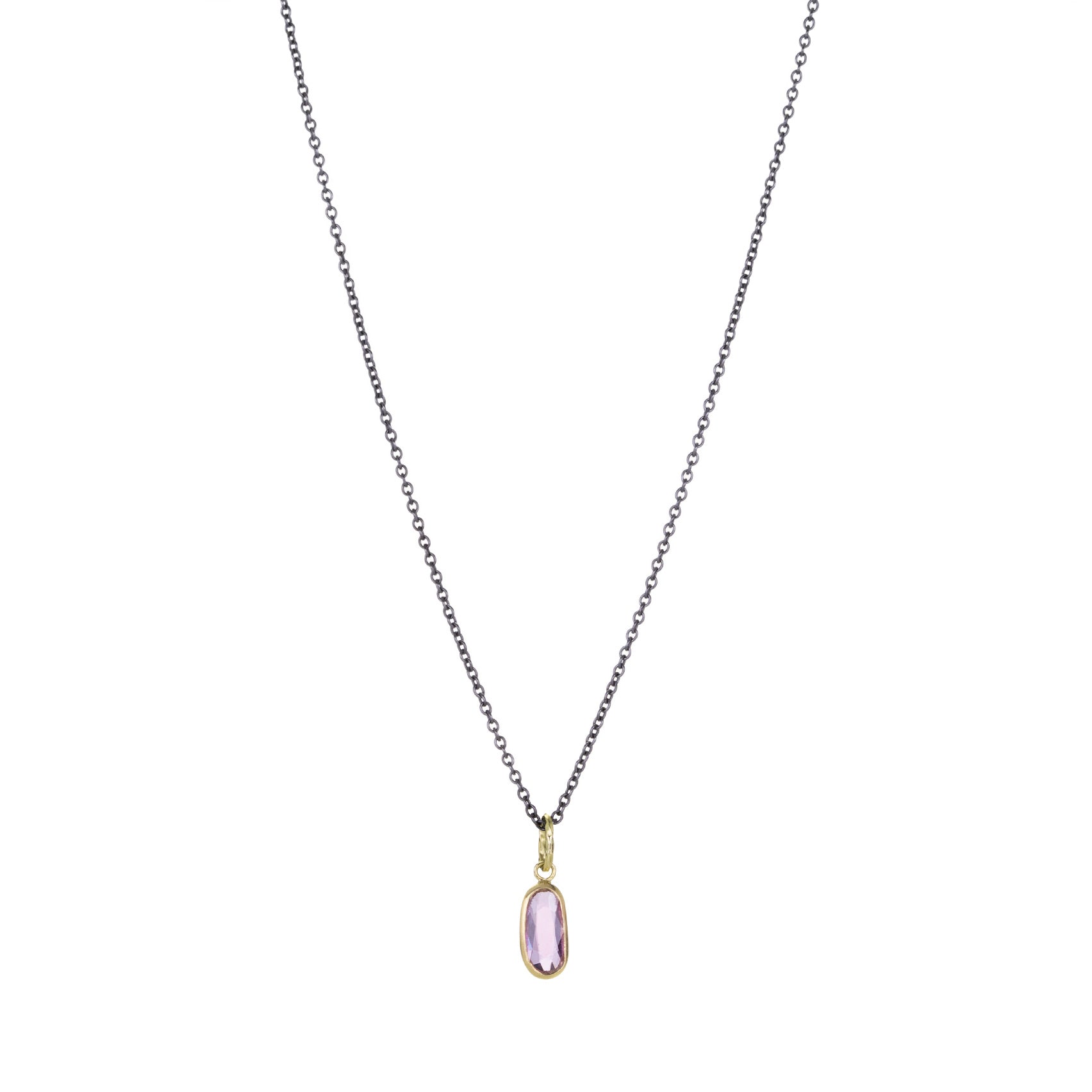 Filled with color and light, this 18k yellow gold pendant from Sarah McGuire features a bezel set 0.66ct faceted pink sapphire. Add this lovely little piece to your other pendants or wear it alone on a chain for a simple, minimalist statement. Length measures 5/8”. Pendant only, chain is sold separately. Handcrafted in Chicago, IL, U.S.