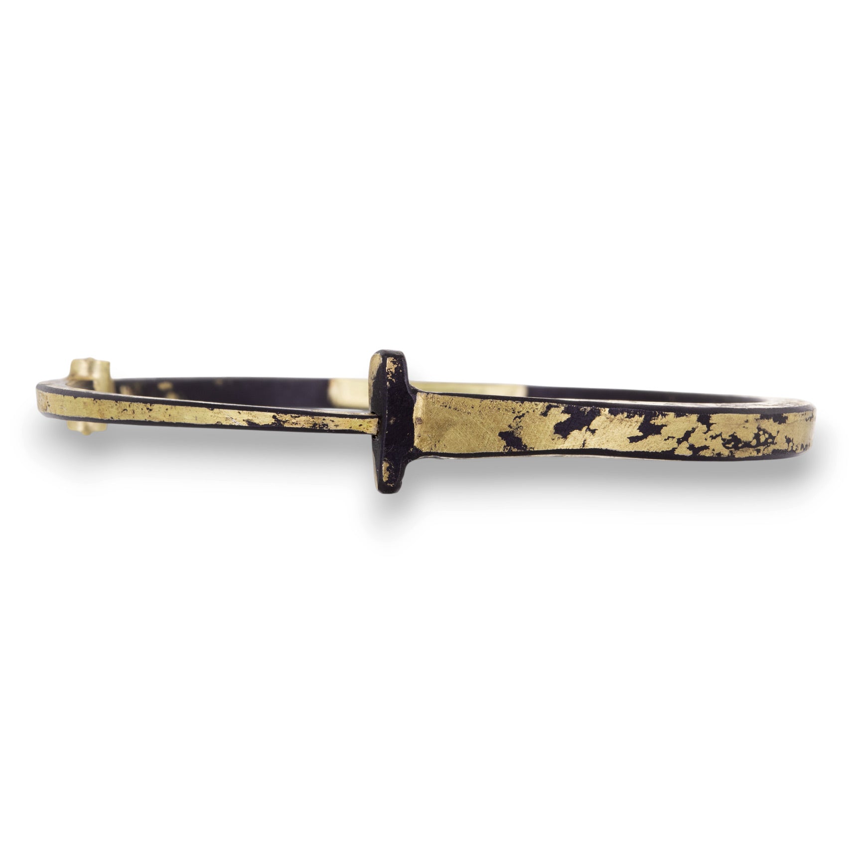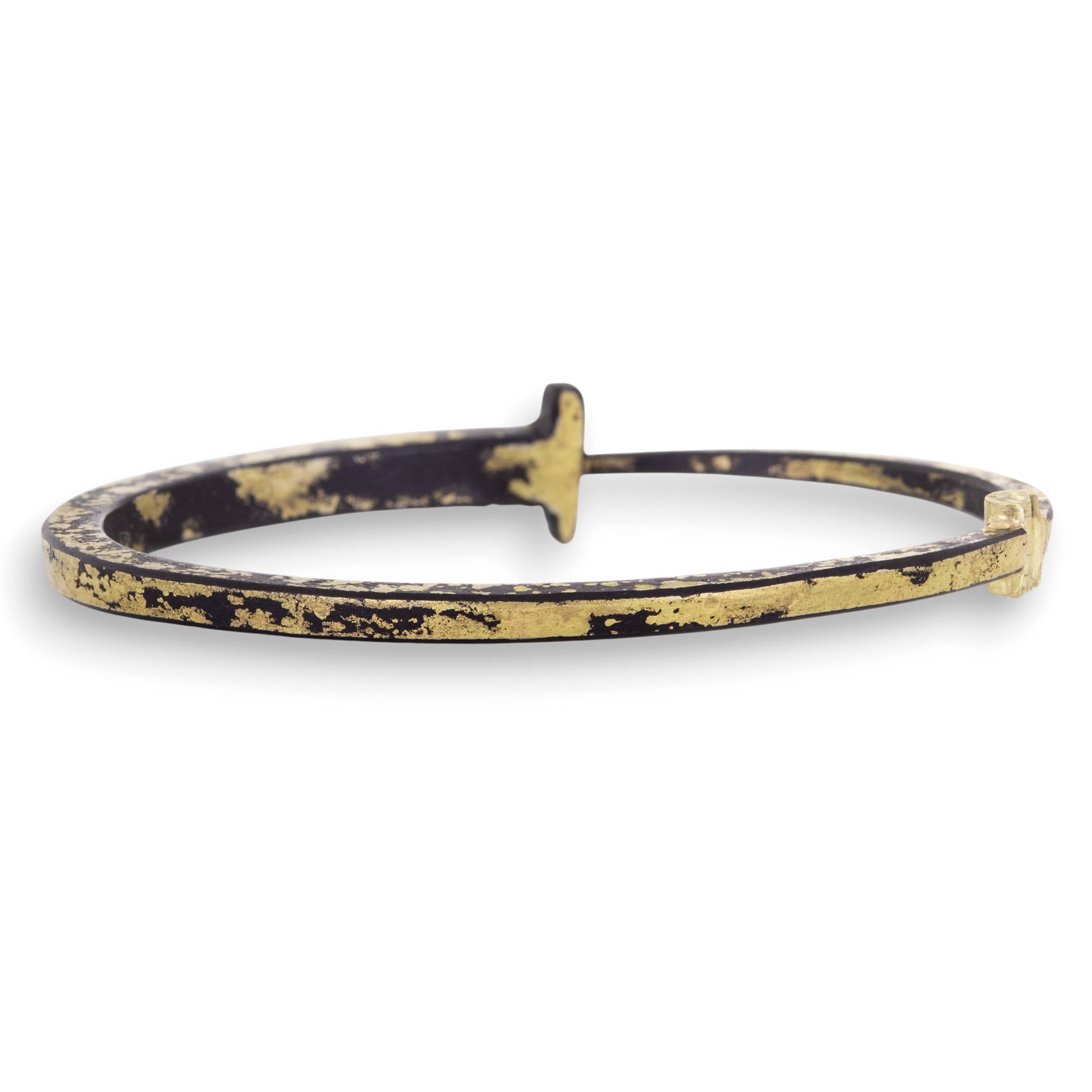 There is a certain artifactual quality to master metalsmith Pat Flynn’s body of work. This iron nail bracelet is hand forged and dusted with 22k yellow gold, imparting the essence of a luxurious patina. An 18k yellow gold handmade hinge snaps firmly for a sure fit. Inner diameter measures 2 3/8" x 2". Handcrafted in High Falls, NY, U.S.