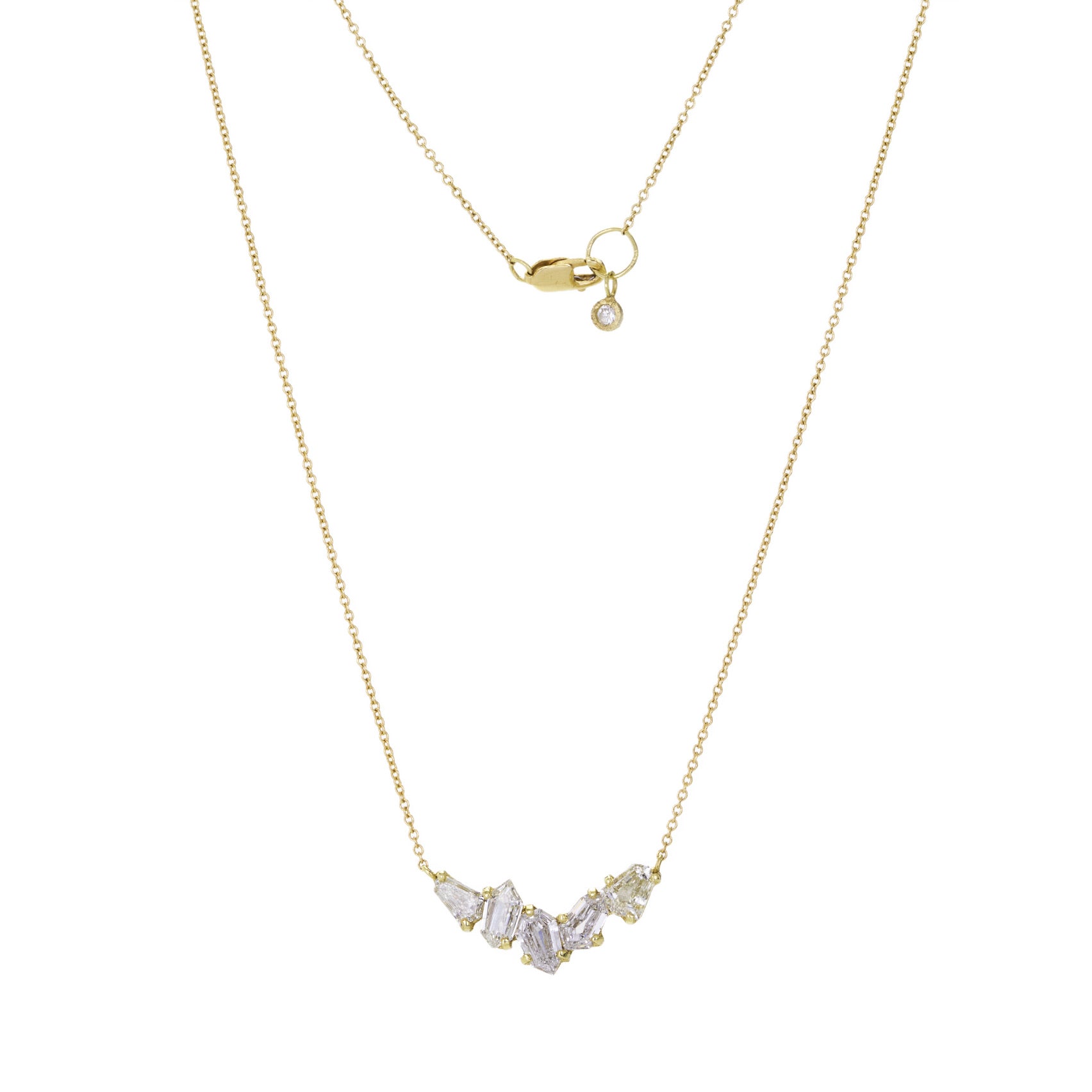 An 18k yellow gold chain with a pendant set with 5 kite shaped diamonds totaling 2.42cts. Pendant measures 1" x 1/2". Total length measures 17". Handcrafted in Cleveland, OH, U.S.