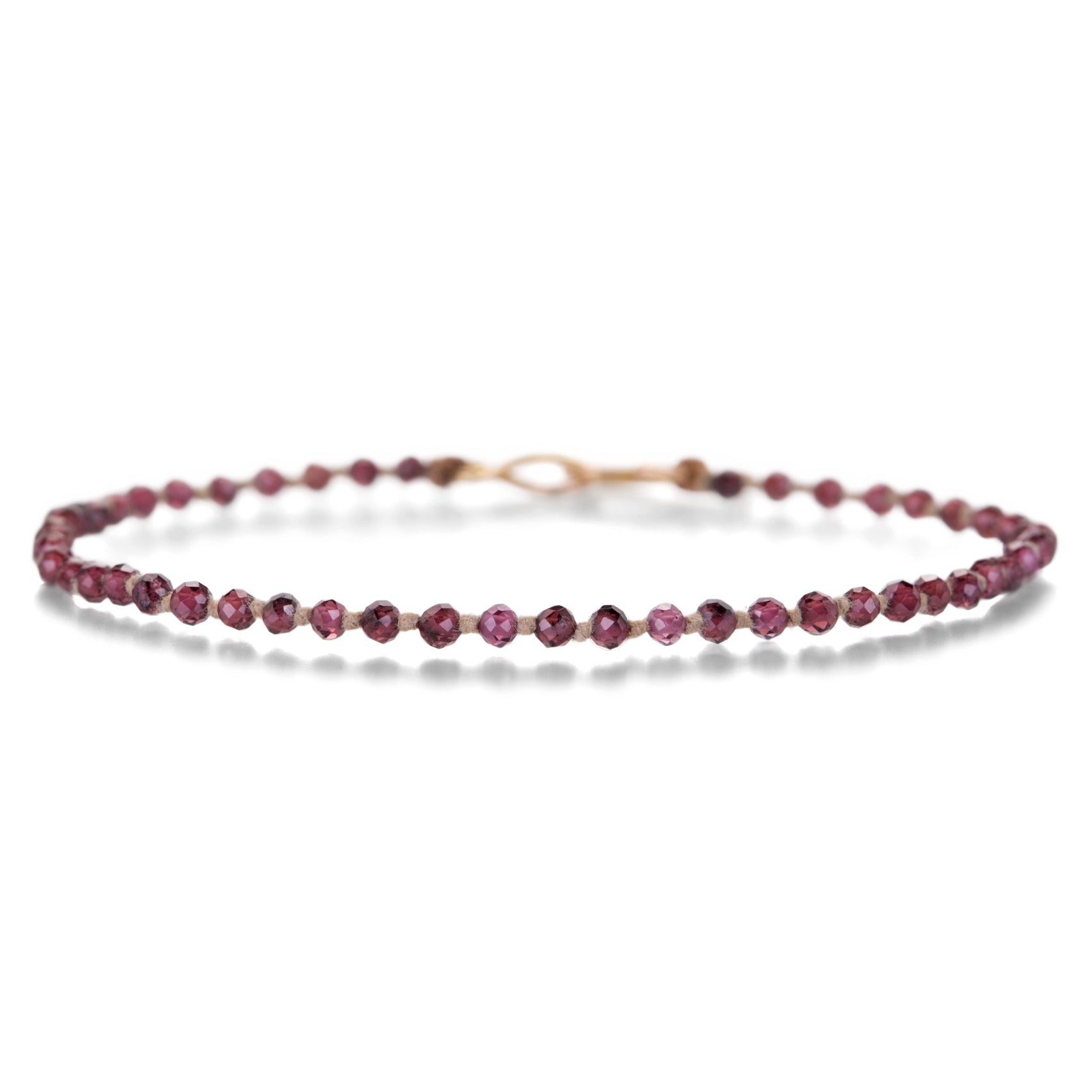 Bring a touch of luscious gemstone sparkle to your stack with this simply elegant beaded bracelet from Lena Skadegard. Faceted garnet beads seem to find the light in a luxurious, hand knotted array. Total length with a 9k yellow gold hook clasp measures 7". Handcrafted in India.