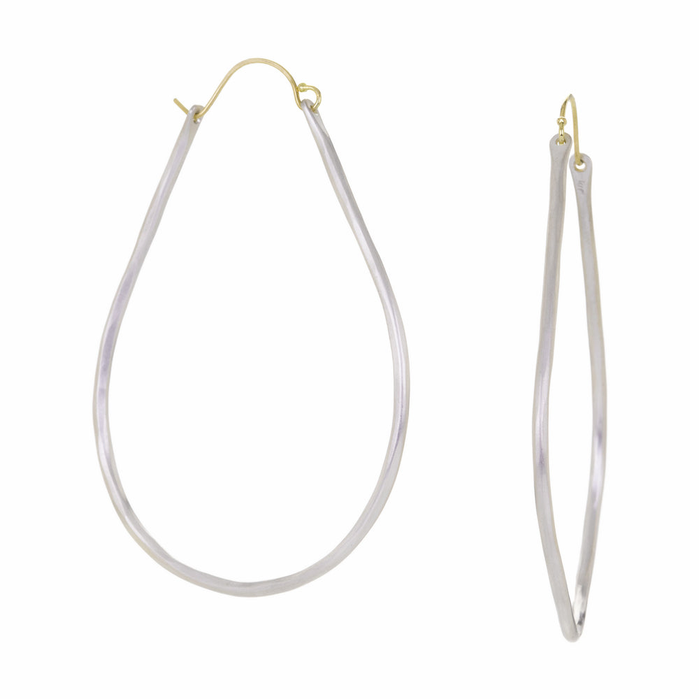 The pear’s graceful, organic form is celebrated in this statement sized pair of sterling silver hoops from Sarah McGuire. Elegant, gently textured open drops bring big, juicy flavor to your hoop collection! Earrings measure 2 3/8" x 1 7/8” with curved 18k yellow gold ear wires. Handcrafted in Chicago, IL, U.S.