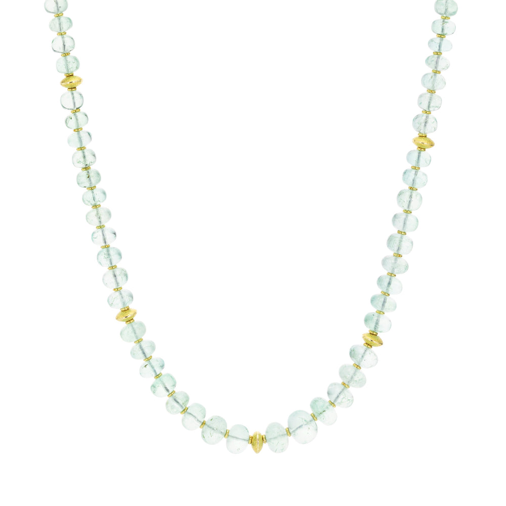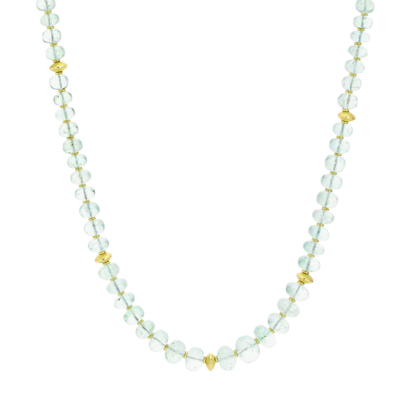 An 18k yellow gold necklace with graduated smooth, seafoam green Columbian emerald rondels totaling 76.55cttw, with eight gold disk beads and small gold jump ring spacers. Total length measures 17.5" including toggle clasp. Handcrafted in Rochester, NY, U.S.