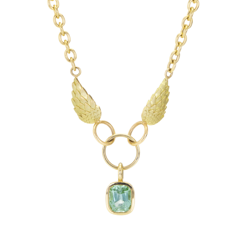 An 18k yellow gold mini tuft wing necklace with a 3mm cable chain and a bezel set, 1.60ct mint green tourmaline. Total length measures 18". Handcrafted in San Antonio, TX, U.S.