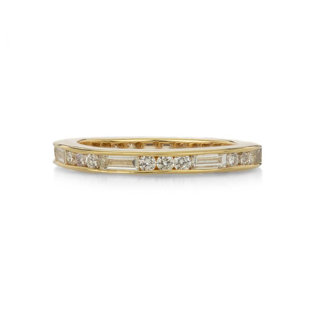 Channel your unique inner light in this Sethi Couture mixed cut diamond eternity band. Crafted in 18k yellow gold, this delightfully detailed ring features a channel set series of three round diamonds alternating with baguette diamonds totaling 1.09cttw. Size 6.5. Handcrafted in Indore, India.
