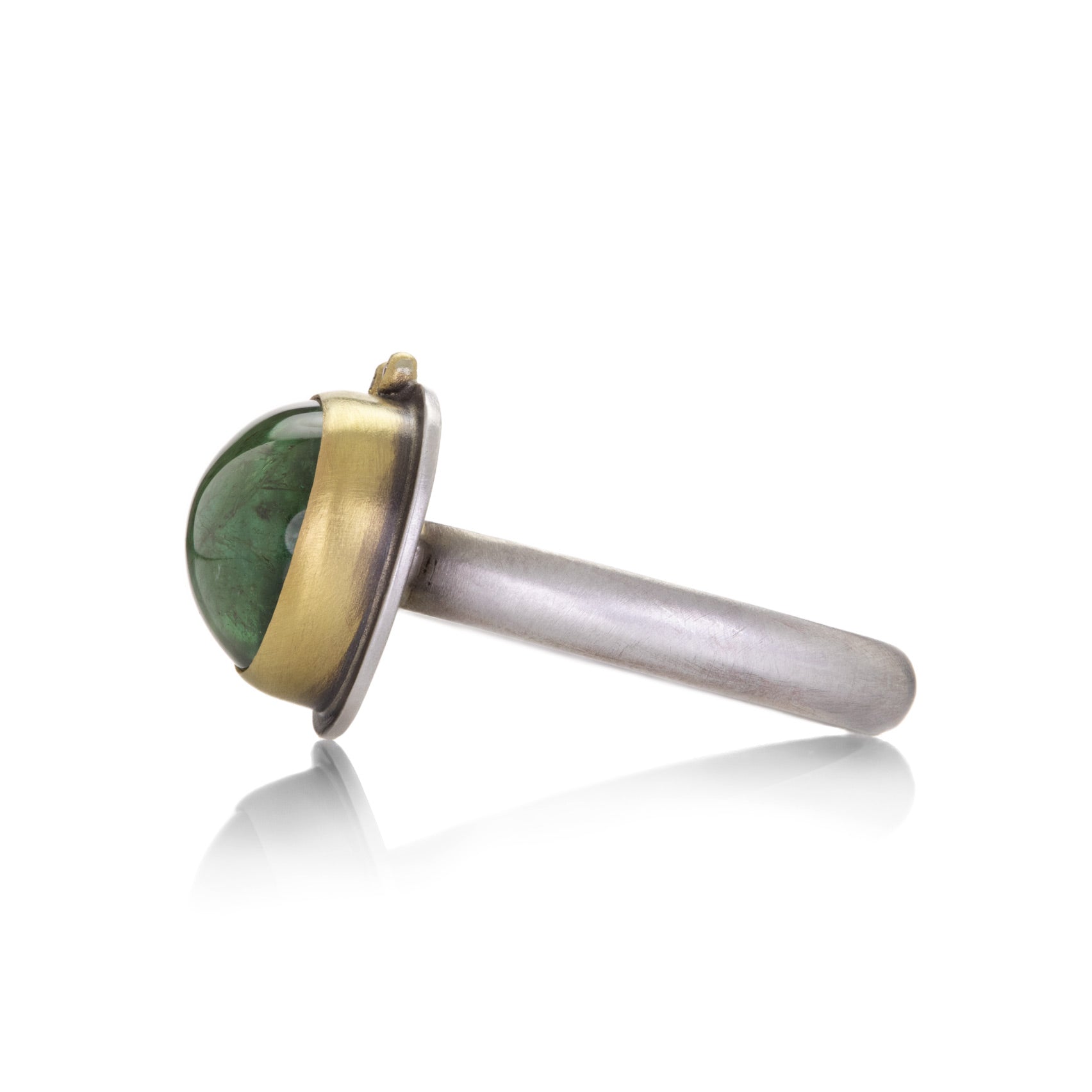 A sterling silver ring with an oval cabochon green tourmaline set in a 22k yellow gold bezel with two small diamonds. Stone measures just over 1/2" in diameter including bezel. Size 6. Handcrafted in Northampton, MA, U.S.