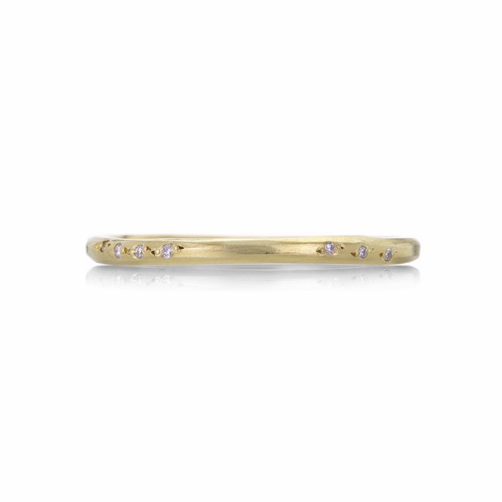 A thin line of sparkling gold adds an earthy elegance to any ring stack. This organic 18k yellow gold band from Sarah McGuire features 13 scattered white diamonds for a hint of magic. Size 6.5. Handcrafted in Chicago, IL, U.S.