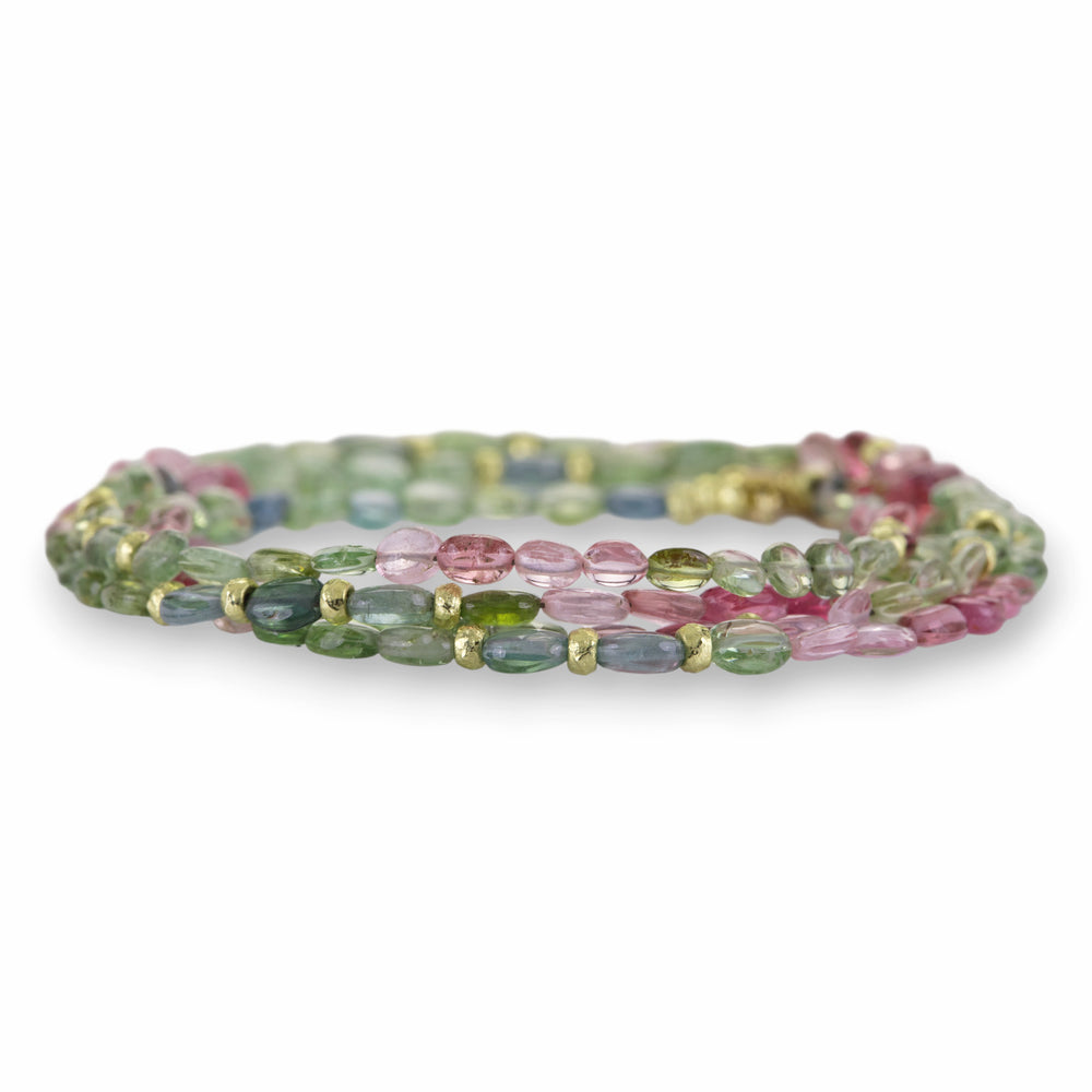 An 18k yellow gold beaded bracelet with smooth oval shaped pink and green tourmaline and scattered gold puff beads. Total length measures 36" including a 2" extension chain and lobster clasp Handcrafted in Rochester, NY, U.S.