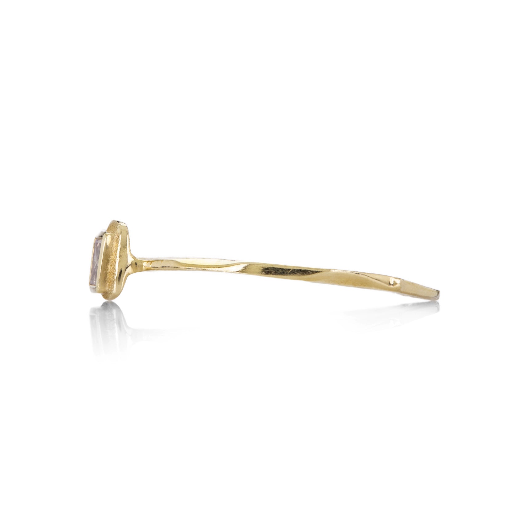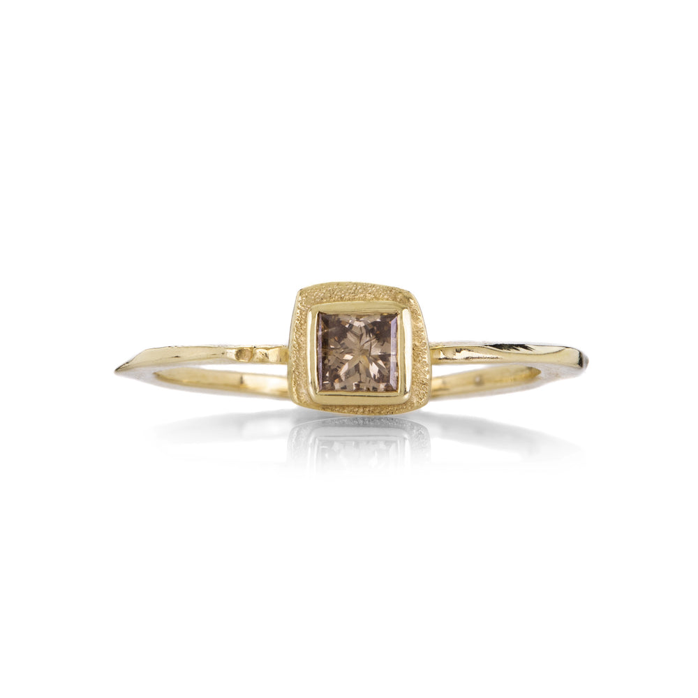 Add a flash of natural fire to your stack in this 18k yellow gold ring from Audrius Krulis. A champagne colored princess diamond is set in a delicately framed and textured bezel. Ultra thin band width measures just 1mm. Size 6. Handcrafted in Montrose, NY, U.S.